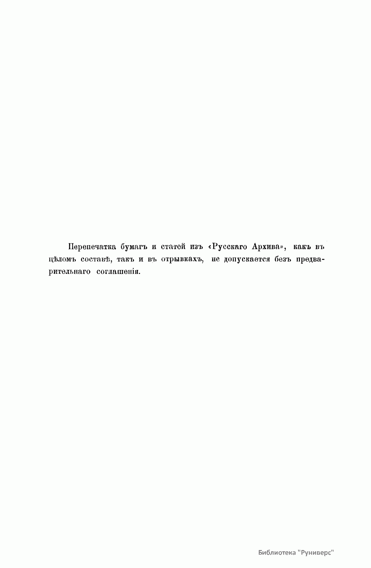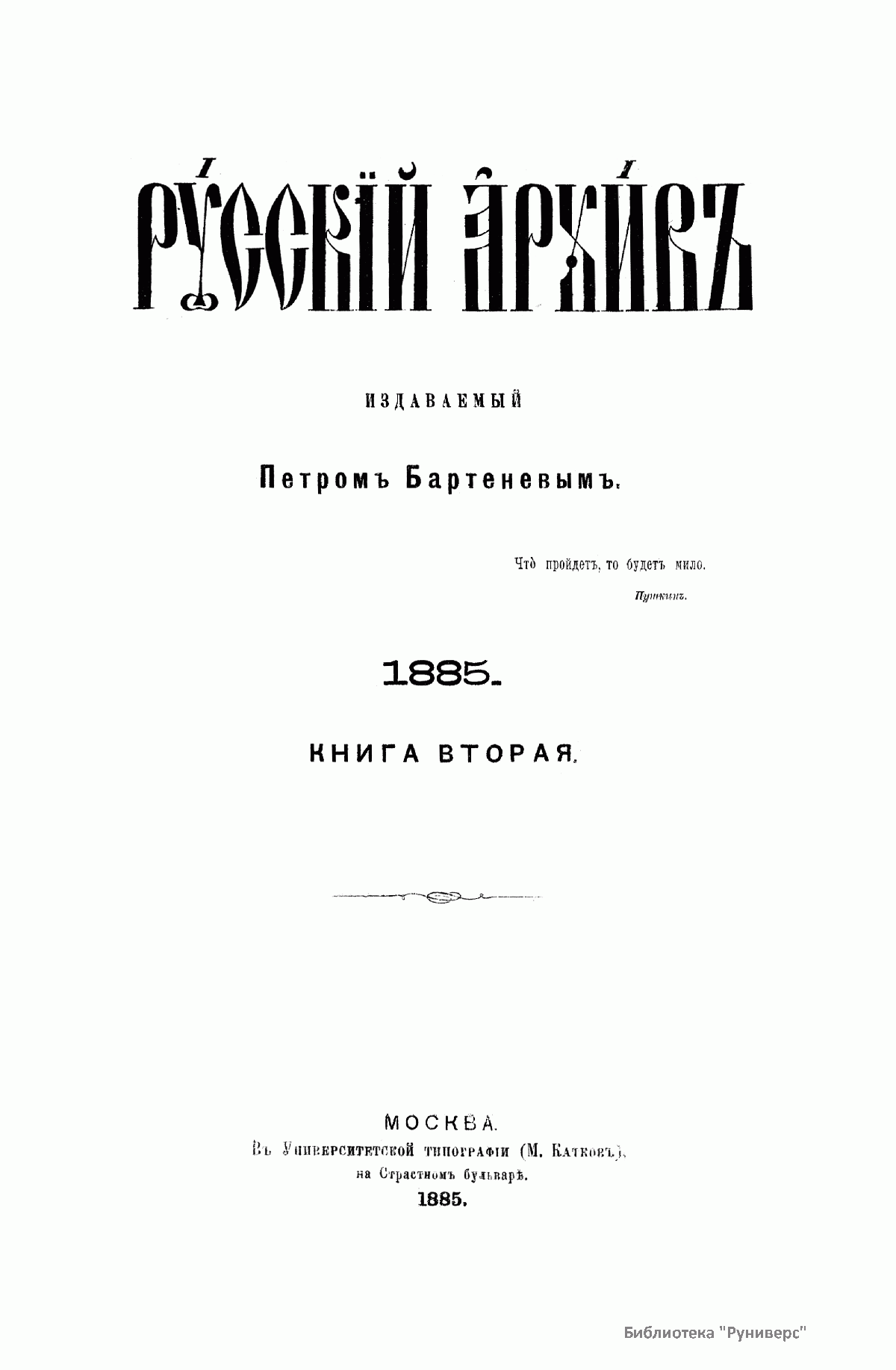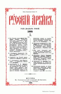 «Русский архив» — ежемесячный историко-литературный журнал, издававшийся в Москве с 1863 по 1917 год. Создателем и продолжительные годы редактором журнала был П. И. Бартенев – историк, археограф, библиограф. Этот журнал называли «живой картиной былого», поскольку он содержал преимущественно публикации неизданных мемуарных, эпистолярных, литературно-художественных и ведомственных документальных материалов, освещавших культурную и политическую историю России в XVIII и XIX вв. По числу опубликованных источников «Русский архив» стоит на первом месте среди русских исторических журналов.
