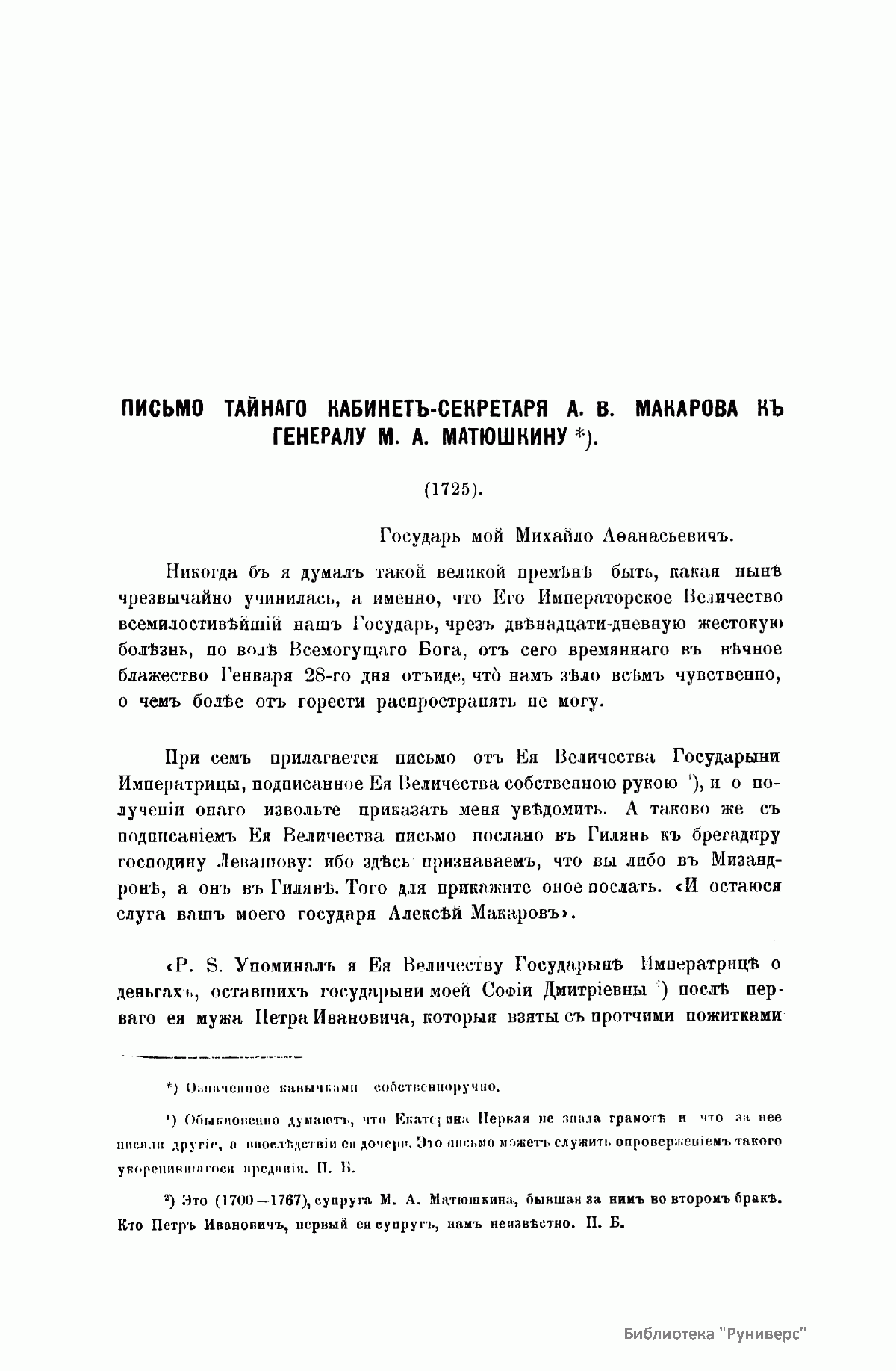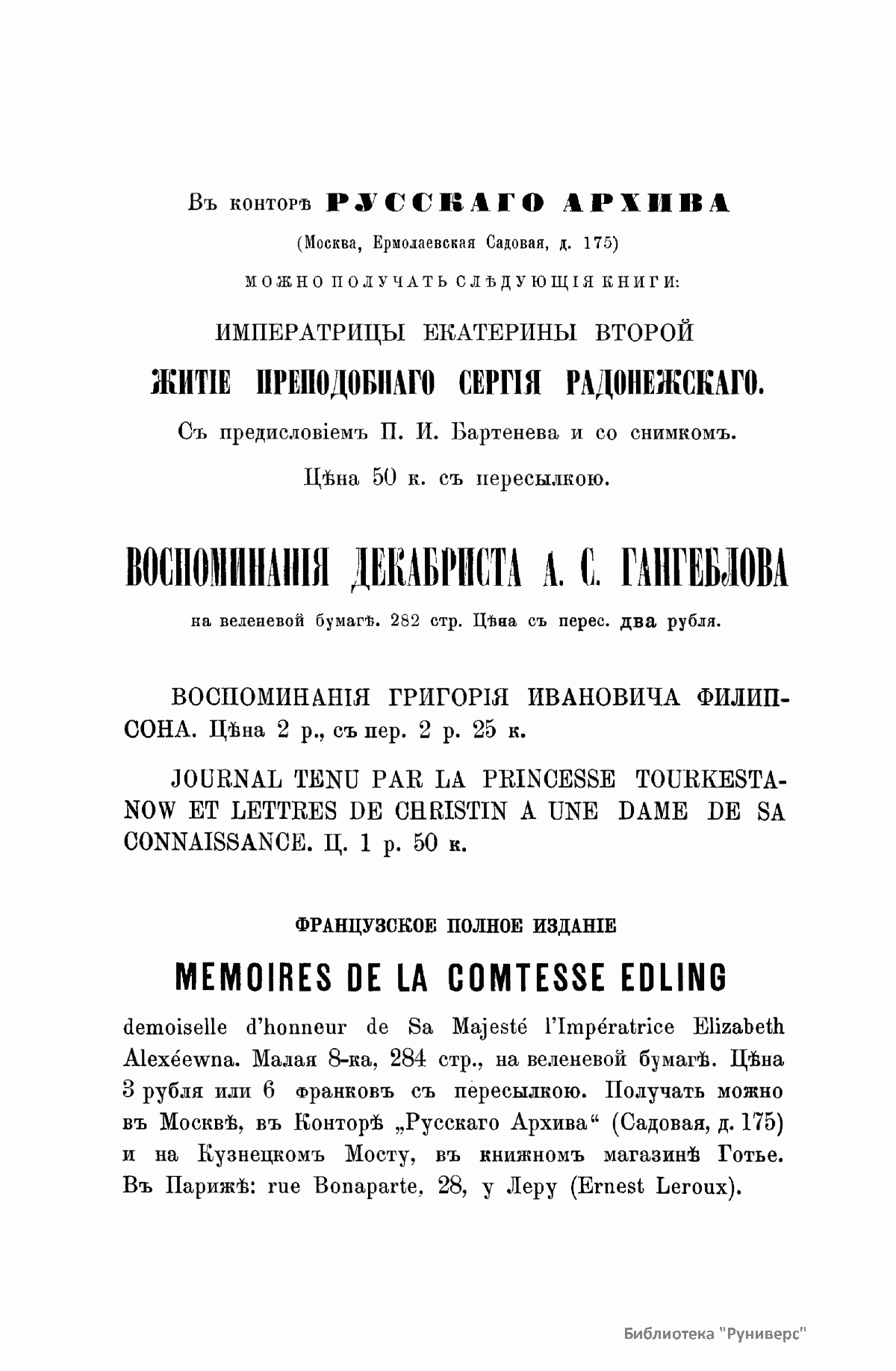 «Русский архив» — ежемесячный историко-литературный журнал, издававшийся в Москве с 1863 по 1917 год. Создателем и продолжительные годы редактором журнала был П. И. Бартенев – историк, археограф, библиограф. Этот журнал называли «живой картиной былого», поскольку он содержал преимущественно публикации неизданных мемуарных, эпистолярных, литературно-художественных и ведомственных документальных материалов, освещавших культурную и политическую историю России в XVIII и XIX вв. По числу опубликованных источников «Русский архив» стоит на первом месте среди русских исторических журналов.