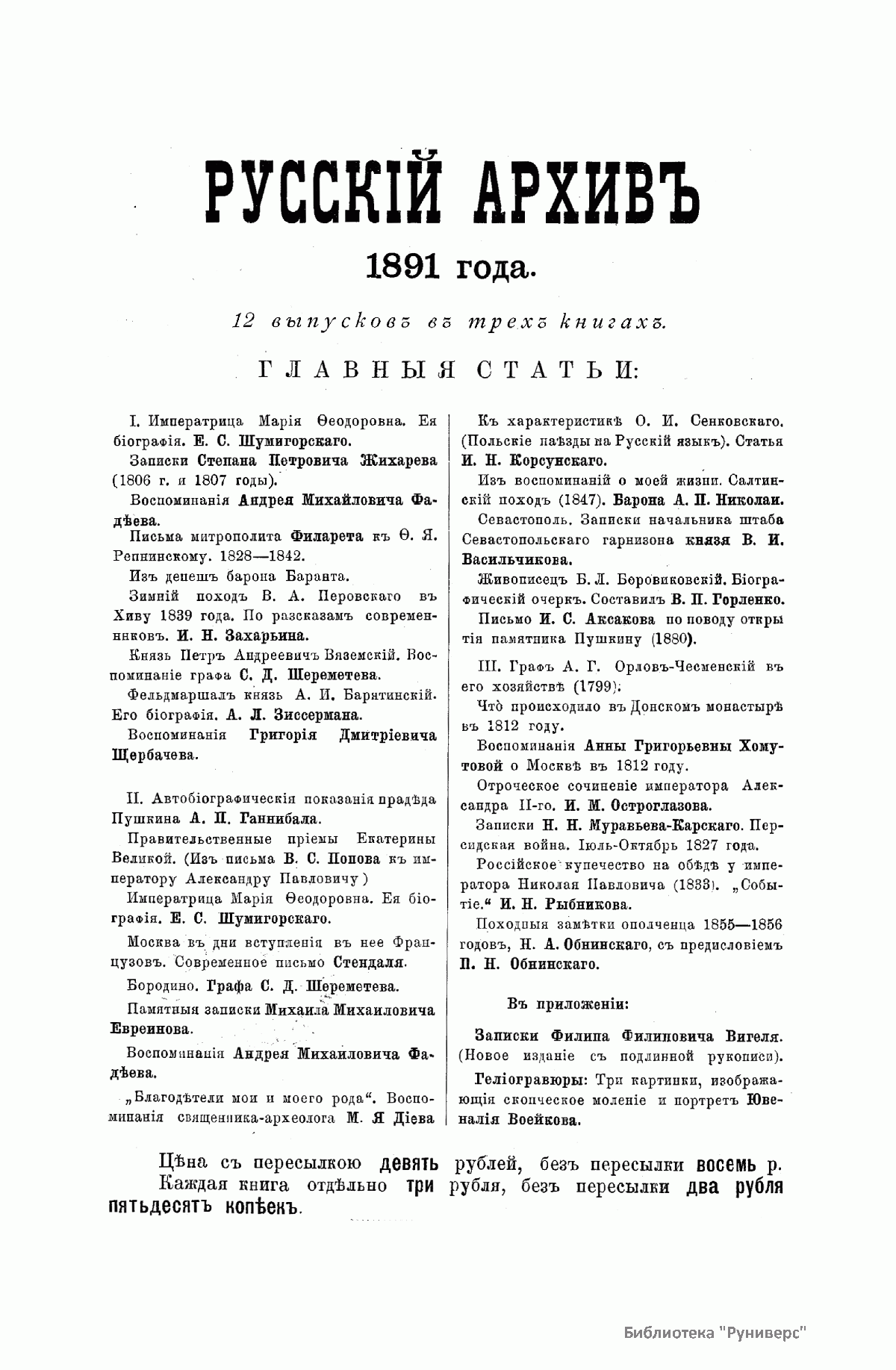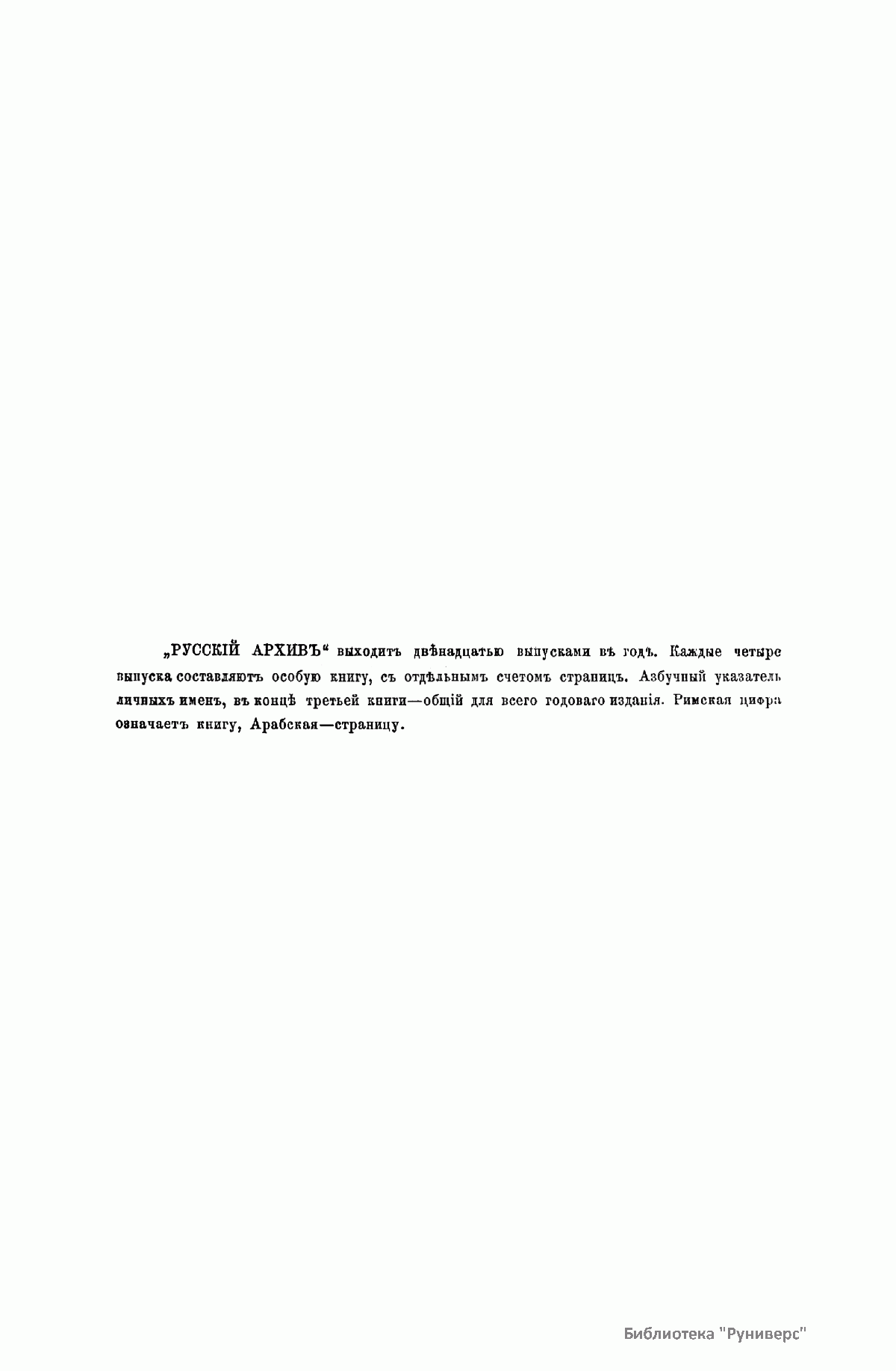 «Русский архив» — ежемесячный историко-литературный журнал, издававшийся в Москве с 1863 по 1917 год. Создателем и продолжительные годы редактором журнала был П. И. Бартенев – историк, археограф, библиограф. Этот журнал называли «живой картиной былого», поскольку он содержал преимущественно публикации неизданных мемуарных, эпистолярных, литературно-художественных и ведомственных документальных материалов, освещавших культурную и политическую историю России в XVIII и XIX вв. По числу опубликованных источников «Русский архив» стоит на первом месте среди русских исторических журналов.