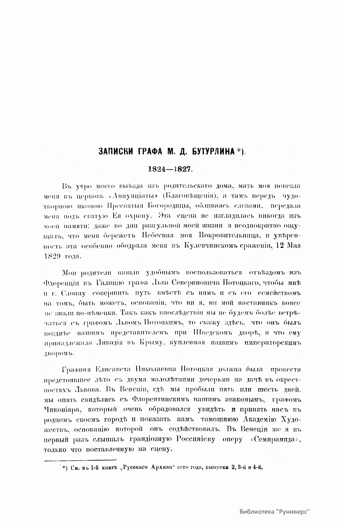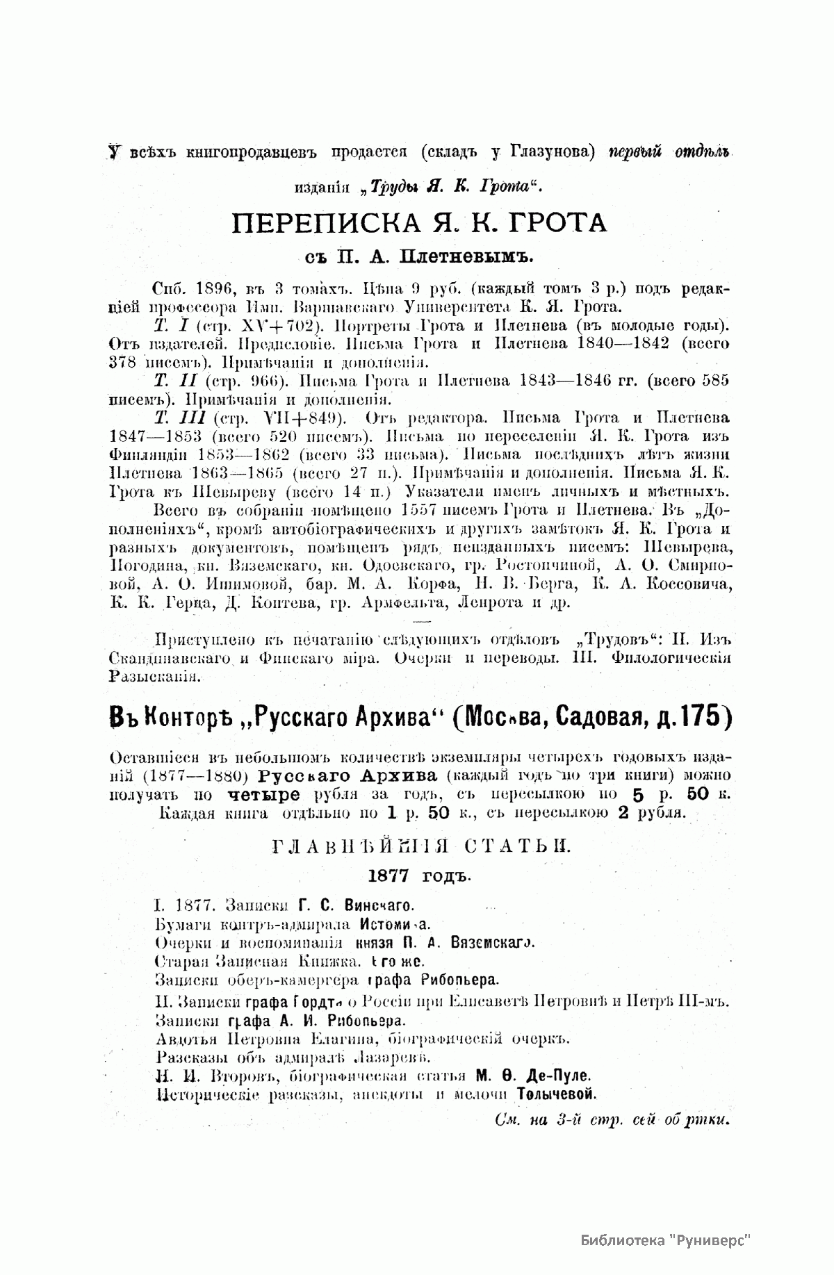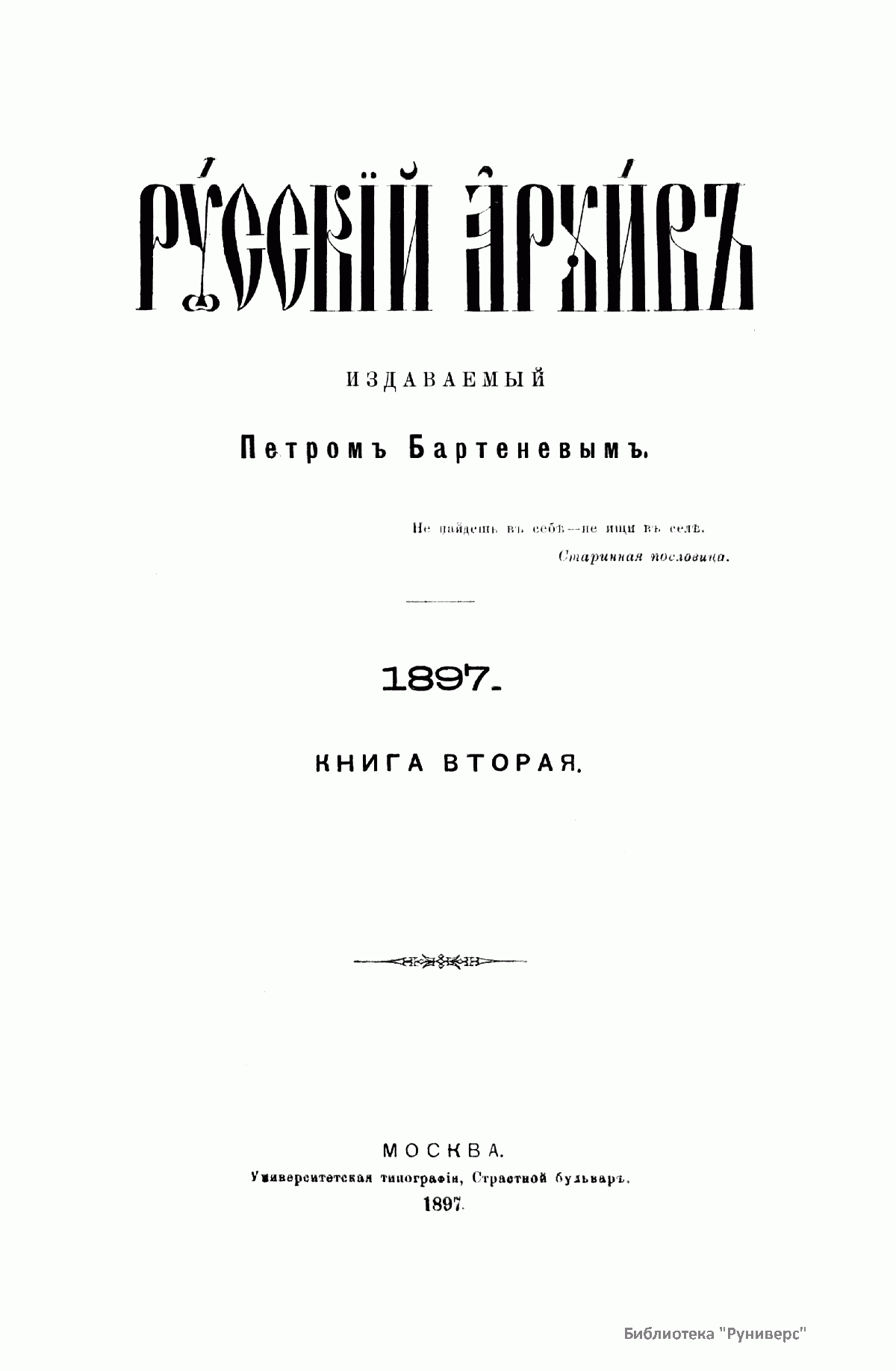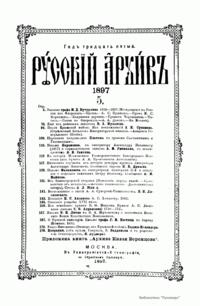 «Русский архив» — ежемесячный историко-литературный журнал, издававшийся в Москве с 1863 по 1917 год. Создателем и продолжительные годы редактором журнала был П. И. Бартенев – историк, археограф, библиограф. Этот журнал называли «живой картиной былого», поскольку он содержал преимущественно публикации неизданных мемуарных, эпистолярных, литературно-художественных и ведомственных документальных материалов, освещавших культурную и политическую историю России в XVIII и XIX вв. По числу опубликованных источников «Русский архив» стоит на первом месте среди русских исторических журналов.