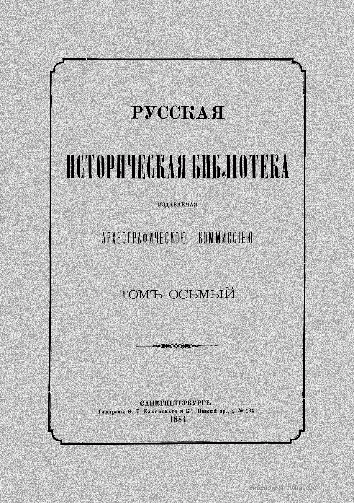 Русская историческая библiотека, издаваемая Археографическою комиссiею. Томъ осьмый