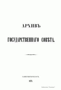 В 1863 г. по высочайшему повелению Александра II началась работа над систематическим описанием архива Государственного совета и Государственной канцелярии. Эта работа была поручена сенатору, историку-юристу Н. В. Калачову и советнику И. А. Чистовичу под высшим наблюдением председателя Государственного совета Д. Н. Блудова. Под их редактурой вышли в свет три тома (восемь книг) «Архива государственного совета»: две части первого тома, охватывающие период с 1768 по 1796 г. и заключающие в себе протоколы Совета, учрежденного императрицей Екатериной II; две части четвертого тома, содержащие журналы Государственного совета по Департаменту законов с 1810 по 1825 г.; две части третьего тома, в которые вошли протоколы Совета при Высочайшем дворе с 1801 по 1810 г.; две части четвертого тома, включающие журналы Государственного совета по Департаменту экономии с 1810 по 1825 г. Со смертью главного редактора издания сенатора Калачова публикация архива была приостановлена. С учетом исторической ценности данного труда, в 1886 г. последовало высочайшее повеление продолжить работу над изданием. Его составление и редактирование было возложено на члена Археографической комиссии Министерства народного просвещения Г. Ф. Штендмана, помощника статс-секретаря Государственного совета П. М. фон Кауфмана и др. В продолжение работы над изданием были опубликованы: третья часть четвертого тома, содержащая материалы по гражданскому отделению Департамента законов (1818–1820); пять частей четвертого тома, в который вошли журналы по Департаменту гражданских и духовных дел (1810 – 19 ноября 1825 г.); первая часть пятого тома, включающая журналы по делам Департамента государственной экономии (20 ноября 1825 г. – 1826).