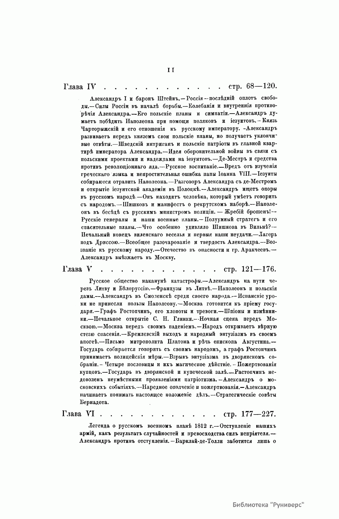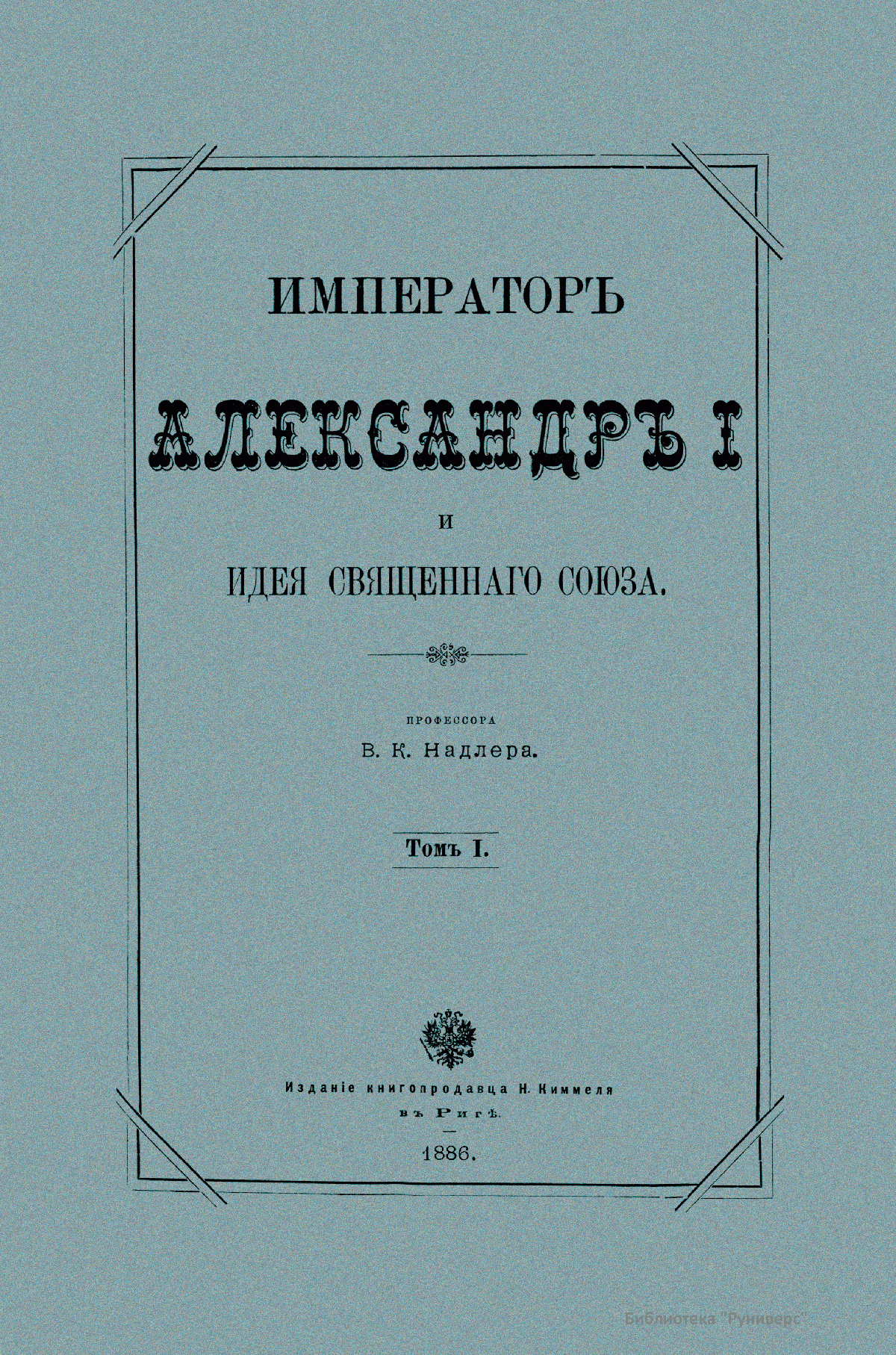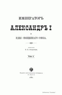 Пятитомное фундаментальное исследование профессора В. К. Надлера «Император Александр I и идея Священного союза» посвящено внешней политике России в 1812–1815 гг. с экскурсами в предшествовавшие и последующие времена и события. Издание было выпущено книгопродавцем Н. Киммелем в Риге в 1886–1892 гг., напечатано в харьковской типографии Окружного штаба. Автор сделал вывод, что идея Священного союза была единственной до начала ХIХ в. «серьезной и искренней попыткой организовать международные отношения на чистых началах христианской нравственности». Акт о Священном союзе содержал религиозно-мистическую фразеологию, возможно заимствованную из учения масонства. В статье I три договаривающихся монарха объявлялись соединенными «узами действительного и неразрывного братства», совсем как члены масонской ложи высоких степеней. Они именовались «тремя ветвями одной семьи» и обязывались помогать друг другу в открытии «сокровищ любви, науки и беспредельной мудрости». Сочинение В. К. Надлера на историческом материале было призвано показать, что создание Священного союза опередило свое время, и не было понято современниками. Том I повествует о внутренней политике в России при Александре I. В нем рассматриваются вопросы внешней политики европейских держав, отношение к Наполеону и Отечественная война 1812 г. Том II рассказывает о завершении Отечественной войны — изгнании французов с земель России, а также переговоры и дипломатические отношения России с союзниками, подготовка к дальнейшей войне против Франции. Том III подводит итог прошедшей войне, здесь рассматриваются стратегические планы на 1813 г., переговорный процесс с союзниками и начало весенней кампании 1813 г. Анализируется ход сражений 1813 г. Том IV повествует о событиях 1814 г.: поражение Наполеона, оккупация Франции, восстановление монархии Бурбонов, переговоры и дипломатическая борьба союзников. Том V рассказывает о событиях 1815 г.: созыв Венского конгресса и его решения о создании Священного Союза, «100 дней» Наполеона и борьба с ним, вторичное восстановление монархии Бурбонов. Василий Карлович Надлер (1844–1894) — историк, профессор Харьковского, Новороссийского университета. Главные труды: «Причины и первые проявления оппозиции католицизму в Чехии и Западной Европе в конце XIV и начала XV века» (Харьков, 1864; магистерская диссертация); «Адальберт Бременский, правитель Германии в молодые годы Генриха IV» (Харьков, 1967; докторская диссертация); «Мифический элемент в истории» (Харьков, 1887) и др.