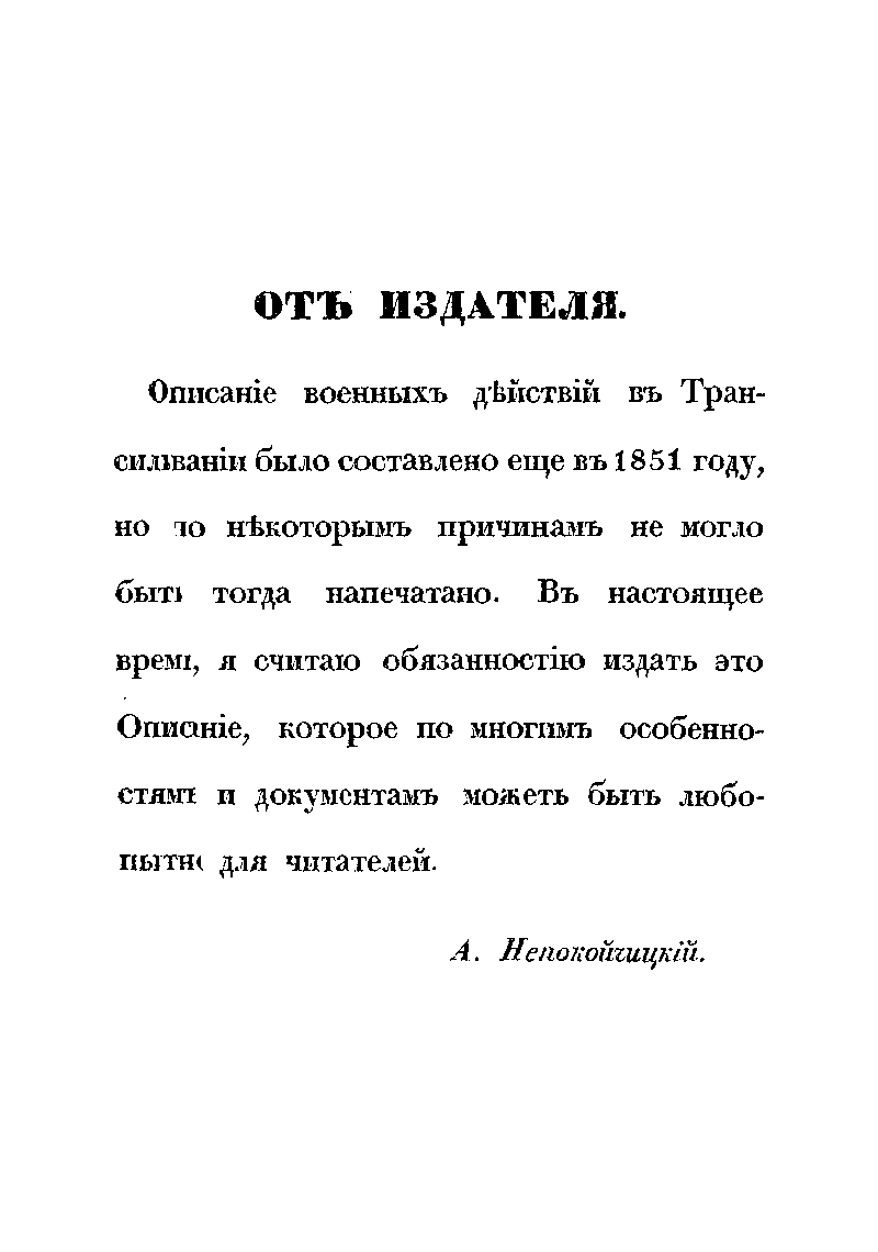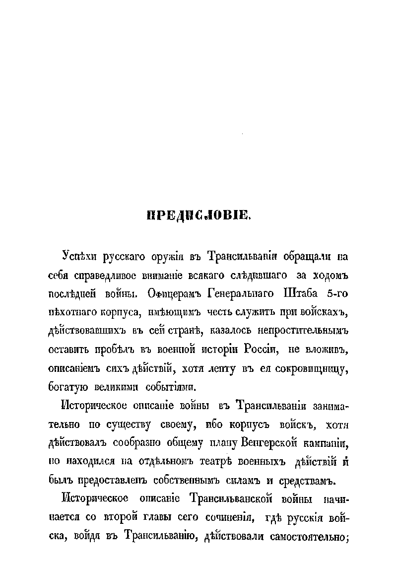 Издание содержит подробное изложение хода весьма успешных боевых действий русских экспедиционных войск в составе 5-го пехотного корпуса генерала от инфантерии А.Н. Лидерса, в военной кампании против венгерской повстанческой армии Ю. Бема в Трансильвании летом 1849 г. Автором этого военно-исторического труда является известный военный деятель российской армии николаевской эпохи генерал А.А. Непокойчицкий, который принимал непосредственное участие в походе в Трансильванию, занимая должность начальника штаба отряда корпуса. Данную работу А.А. Непокойчицкий написал сразу же по завершении военной кампании, в 1851 г. Однако, начало Крымской войны 1853-1856 гг. помешало изданию этой книги. Автор подробно описывает выступление частей 5-го корпуса из Бухареста, бой у монастыря Предял и взятие укрепленной позиции повстанцев у Кронштадта (Брашова). Затем части корпуса участвовали в преследовании противника к г. Сфынтул-Георге, боях при взятии укреплений в Темешском и Ротенбургском ущельях, занятии Германштадта (Сибиу), сражениях при Сегешваре (Сигишоаре) и у Мюльбаха (Себеш) и, наконец, в занятии г. Дева и принятии сдачи отрядов Беккера и Фрумера у Сасварошу (Орэштие). В качестве приложений публикуются ведомости численности русских войск, принимавших участие в походе в Трансильванию, а также общая численность потерь личного состава корпуса в ходе этой кампании. Помимо этого приведены данные о численности войск австрийских союзников – их боевое расписание на немецком языке.