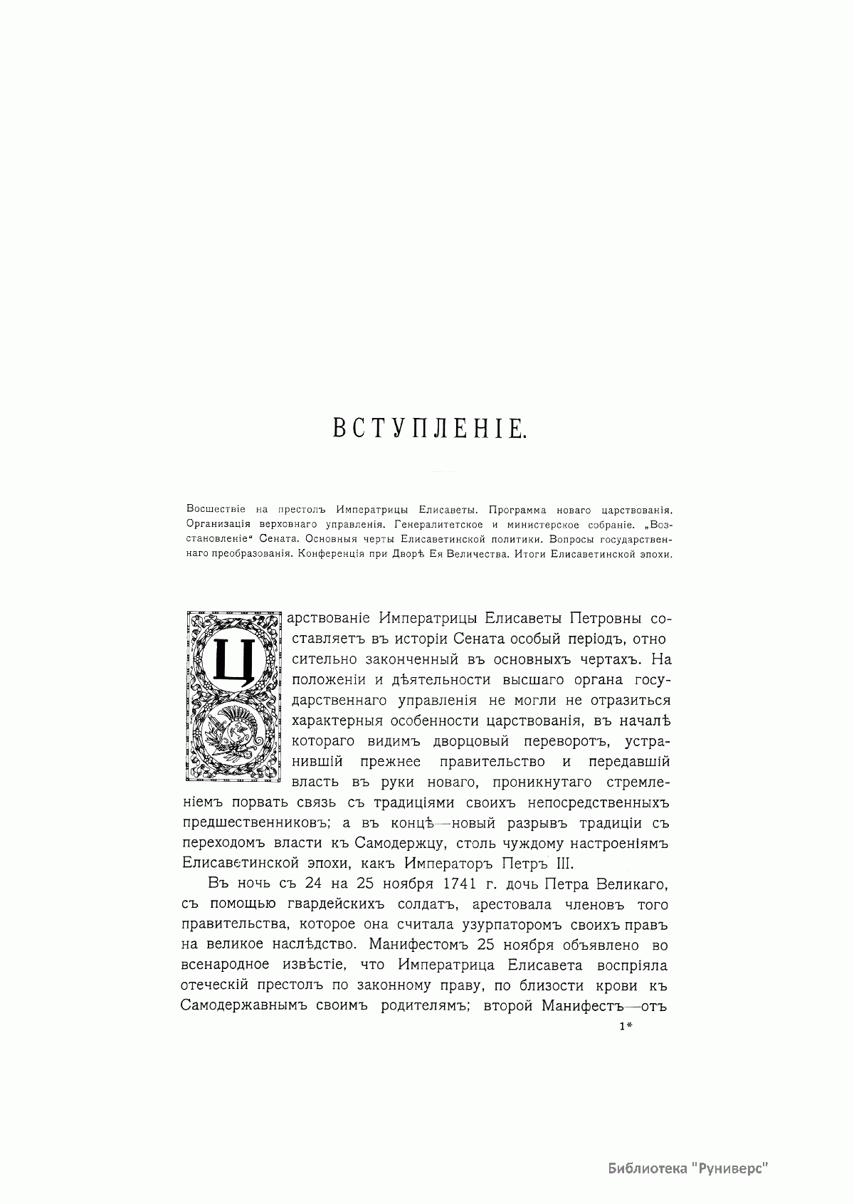 Настоящее издание посвящено истории Правительствующего сената — высшего государственного органа Российской империи, подчиненного императору. Учрежденный Петром Великим, за годы своего существования Сенат претерпевал значительные изменения, поскольку каждый русский монарх видоизменял этот орган в соответствии с собственным видением задач государственного управления. В данном издании все изменения функций Сената прослежены преимущественно по периодам правлений русских монархов. Первый и второй тома посвящены истории Сената в XVIII в., материалы, относящиеся к деятельности Сената в XIX в., составляют третий и четвертый тома. В дополнительный пятый том вошли статьи, посвященные местонахождению и убранству Сената, изданиям при Сенате, форменной одежде сенаторов, чинов обер-прокурорского надзора и канцелярии Сената, в качестве приложений помещены список сенаторов за 200 лет и алфавитные указатели. Составлением этого фундаментального труда занималась специальная комиссия под председательством сенатора Н. А. Добровольского. Редактура отдельных томов была возложена на заслуженного ординарного профессора Императорского Московского университета А. Н. Филиппова, ординарного профессора Санкт-Петербургского университета С. Ф. Платонова, доктора русской истории, библиотекаря Императорской публичной библиотеки Н. Д. Чечулина, ординарного профессора Императорского училища правоведения Э. Н. Берендтса. При этом редакторы, с одобрения комиссии, могли привлекать сотрудников для обработки отдельных глав и частей томов (в общей сложности подготовкой текстовой части занимались 17 человек). Перед составителями истории Сената была поставлена конкретная цель: полное и точное изображение деятельности работы Сената во все эпохи его двухвековой деятельности должно было сочетать в себе серьезность научного исследования и доступность литературного изложения. В подготовке издания использовались материалы почти всех центральных архивов и библиотек России, в том числе закрытого для широко доступа архива Собственной его императорского величества канцелярии. В результате проделанной работы вышел в свет труд, отличающийся исторической полнотой и новизной, в научное обращение было введено много ранее не опубликованных документов. Издание иллюстрируют портреты императоров и сенаторов, виды зданий Сената и интерьеров, факсимиле важнейших документов. Наиболее ценный художественный материал был получен из коллекций и изданий Великого князя Николая Михайловича и из коллекции П. Я. Дашкова; были также использованы коллекции Императорского Эрмитажа, Императорской публичной библиотеки и частных лиц.