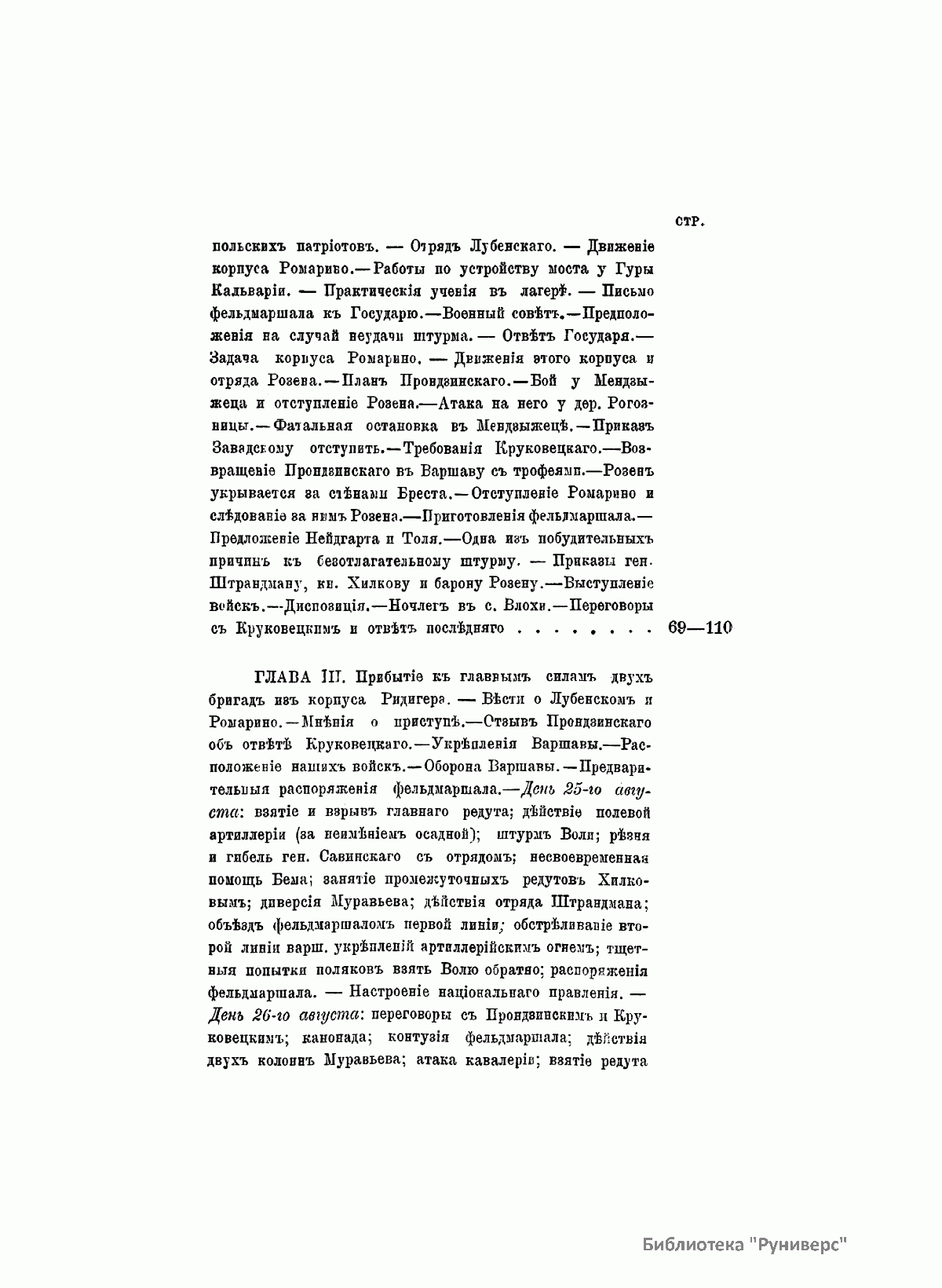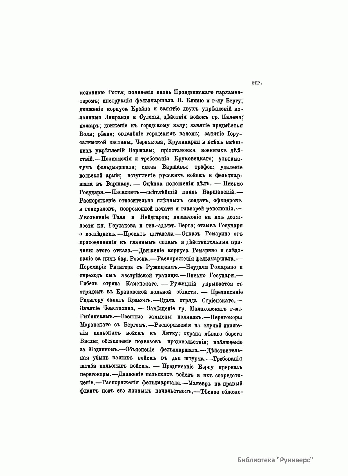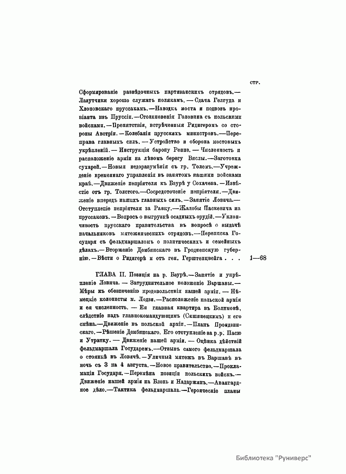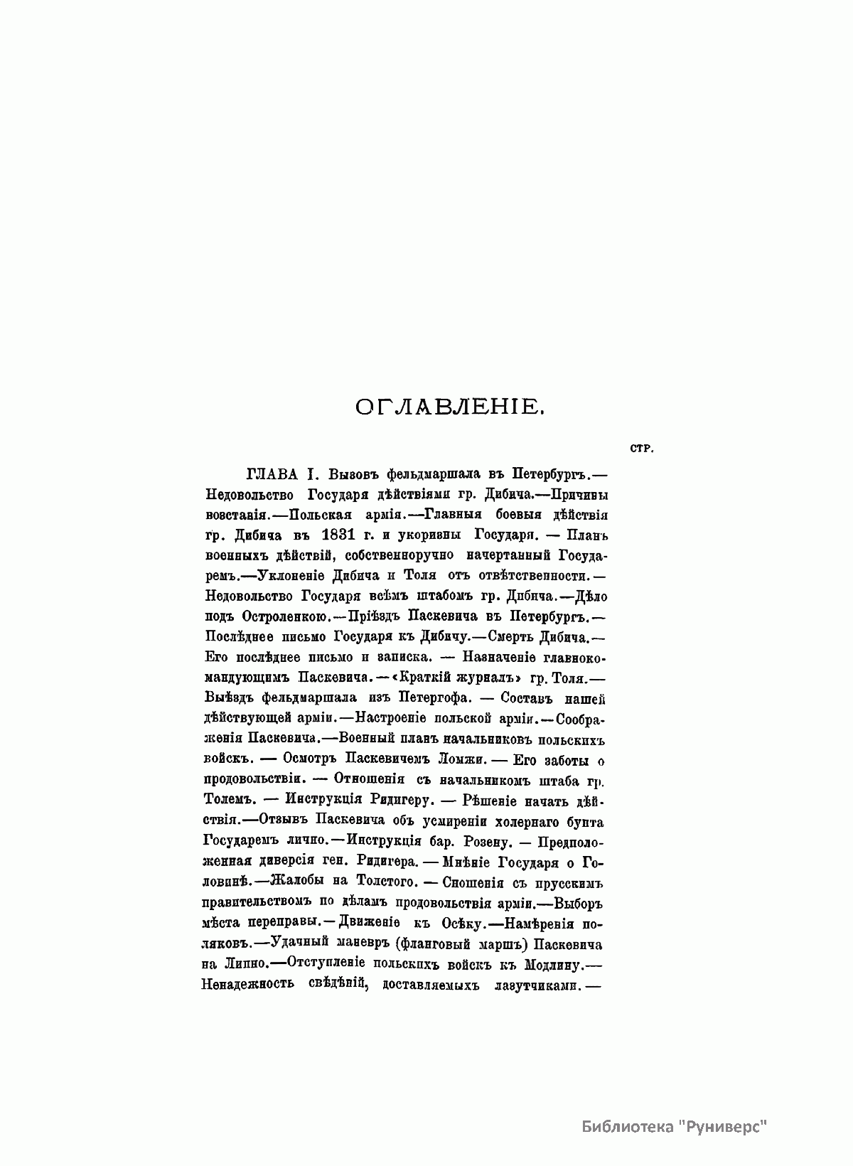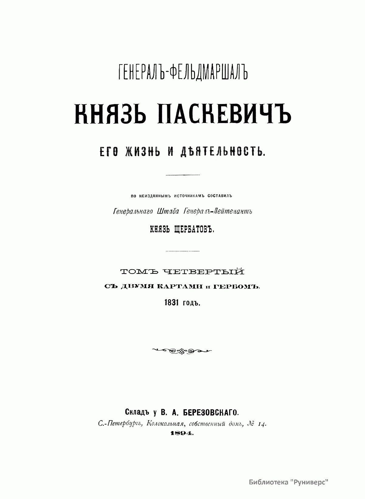 Данное издание князя Александра Петровича Щербатова (1836– ? ) представляет собой полное жизнеописание Ивана Федоровича Паскевича (1782–1856) — графа Эриванского (1828), светлейшего князя Варшавского (1831), видного российского военного и государственного деятеля. Иван Федорович Паскевич участвовал в русско-турецкой войне 1806–1812 гг. Во время Отечественной войны 1812 г. и заграничных походов 1813–1814 гг. командовал дивизией. В 1817–1819 гг. состоял при великом князе Михаиле Павловиче, затем командовал гвардейской пехотной дивизией, в которой служил будущий император Николай I, что способствовало быстрой карьере Паскевича, ставшего одним из наиболее близких к Николаю I лиц. Был членом Верховного суда по делу декабристов. С 1826 г. командовал войсками в Закавказье, в марте 1827 г. стал наместником на Кавказе. Во время русско-иранской и русско-турецкой войн был главнокомандующим войсками на Кавказском театре военных действий. Руководил подавлением Польского восстания 1830–1831 гг., после чего был назначен наместником Царства Польского, проводил политику национального угнетения и русификации. В 1849 г. командовал войсками при подавлении Венгерской революции (1848–1849). Во время Крымской войны (1853–1856) был главнокомандующим войсками на западных границах и на Дунае. Этот капитальный труд, основанный на подлинных архивных документах, иллюстрируют планы сражений и карты театров военных действий, в которых принимал участие И. Ф. Паскевич.