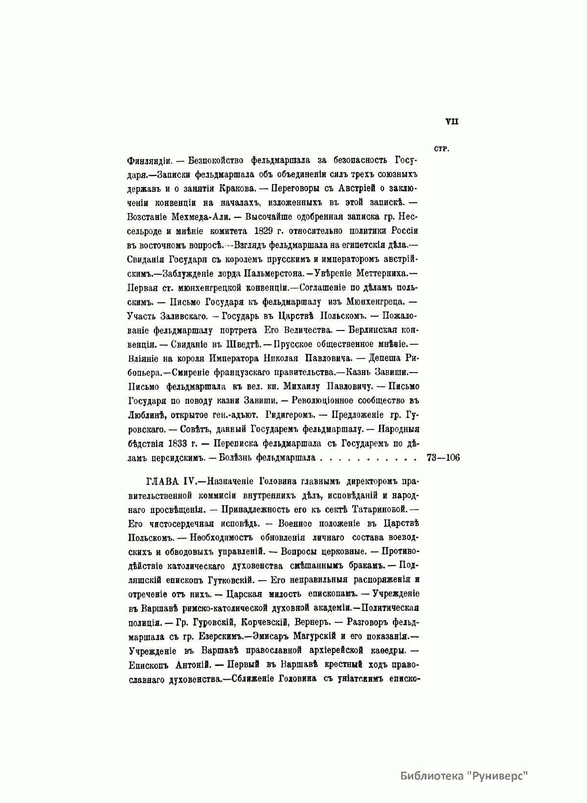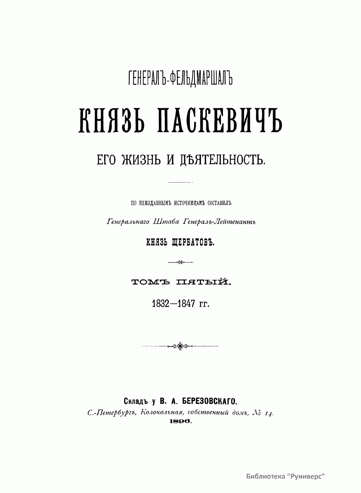 Данное издание князя Александра Петровича Щербатова (1836– ? ) представляет собой полное жизнеописание Ивана Федоровича Паскевича (1782–1856) — графа Эриванского (1828), светлейшего князя Варшавского (1831), видного российского военного и государственного деятеля. Иван Федорович Паскевич участвовал в русско-турецкой войне 1806–1812 гг. Во время Отечественной войны 1812 г. и заграничных походов 1813–1814 гг. командовал дивизией. В 1817–1819 гг. состоял при великом князе Михаиле Павловиче, затем командовал гвардейской пехотной дивизией, в которой служил будущий император Николай I, что способствовало быстрой карьере Паскевича, ставшего одним из наиболее близких к Николаю I лиц. Был членом Верховного суда по делу декабристов. С 1826 г. командовал войсками в Закавказье, в марте 1827 г. стал наместником на Кавказе. Во время русско-иранской и русско-турецкой войн был главнокомандующим войсками на Кавказском театре военных действий. Руководил подавлением Польского восстания 1830–1831 гг., после чего был назначен наместником Царства Польского, проводил политику национального угнетения и русификации. В 1849 г. командовал войсками при подавлении Венгерской революции (1848–1849). Во время Крымской войны (1853–1856) был главнокомандующим войсками на западных границах и на Дунае. Этот капитальный труд, основанный на подлинных архивных документах, иллюстрируют планы сражений и карты театров военных действий, в которых принимал участие И. Ф. Паскевич.