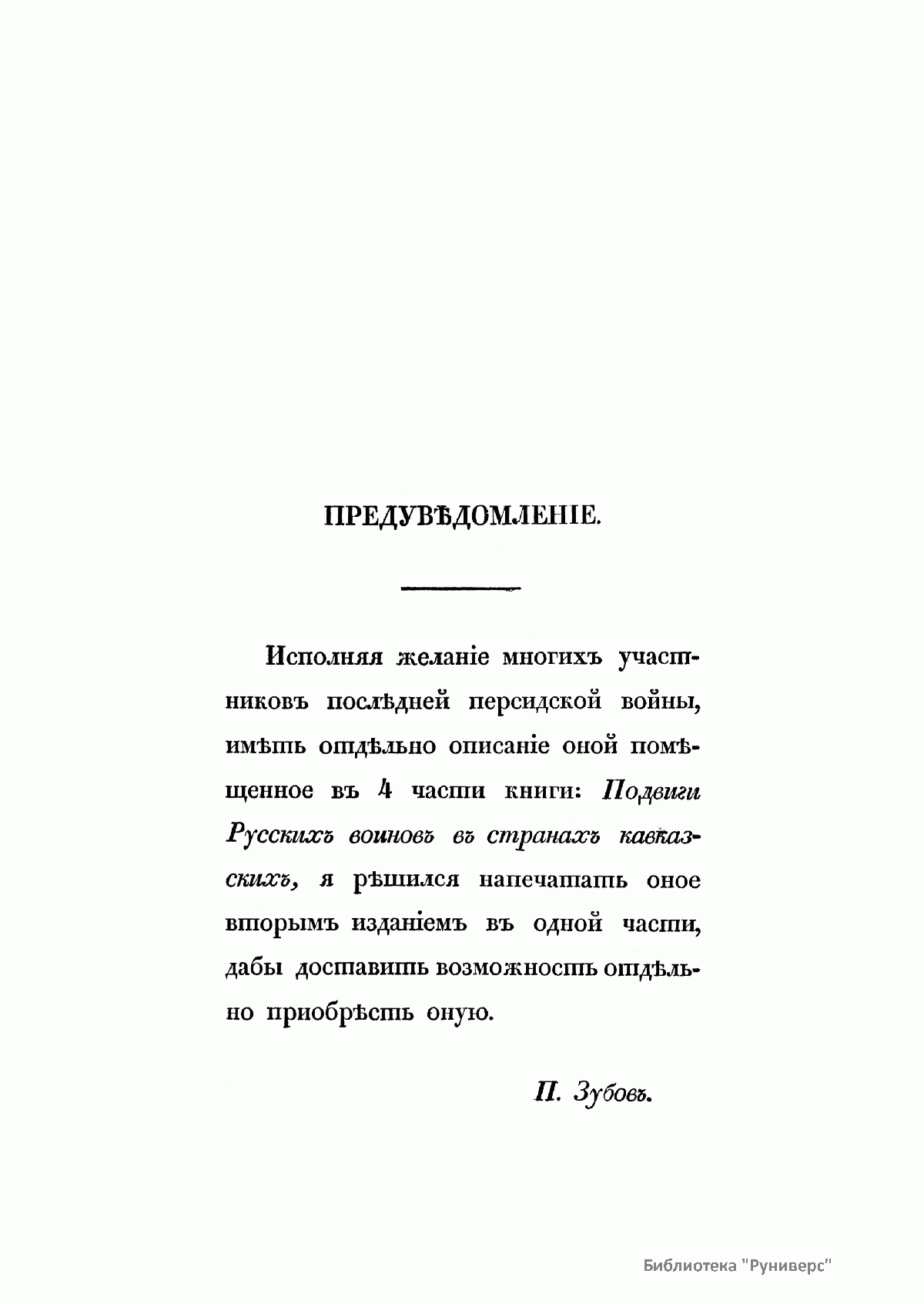 В книге широко известного в 1-й половине XIX в. русского писателя, поэта, публициста и авантюриста П.П. Зубова описывается русско-иранская война 1826 – 1828 гг., в которой автор принимал активное участие в качестве рядового (был разжалован из офицеров) 40-го Егерского полка. Живо и обстоятельно Зубов описывает боевые действия в Закавказье: оборону Шуши, бои против лезгин, сражения с персами под Елисаветполем и Эриванью и т.д.