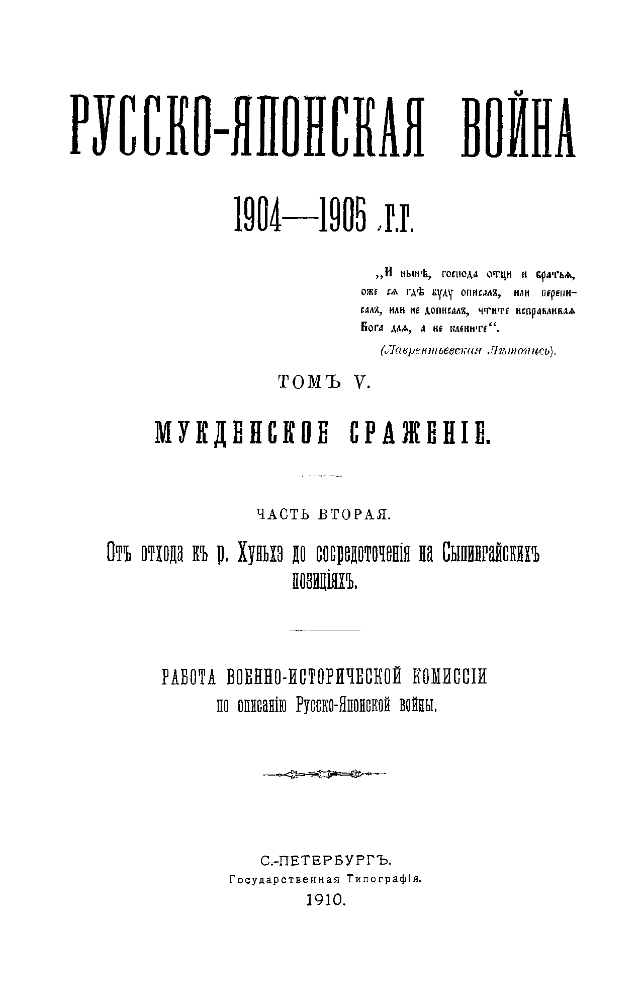 Русско-Японская война 1904-1905 гг. Томъ V. Мукденское сраженiе. Часть вторая. Отъ отхода къ р. Хуньхэ до сосредоточенiя на Сыпингайскихъ позицiяхъ