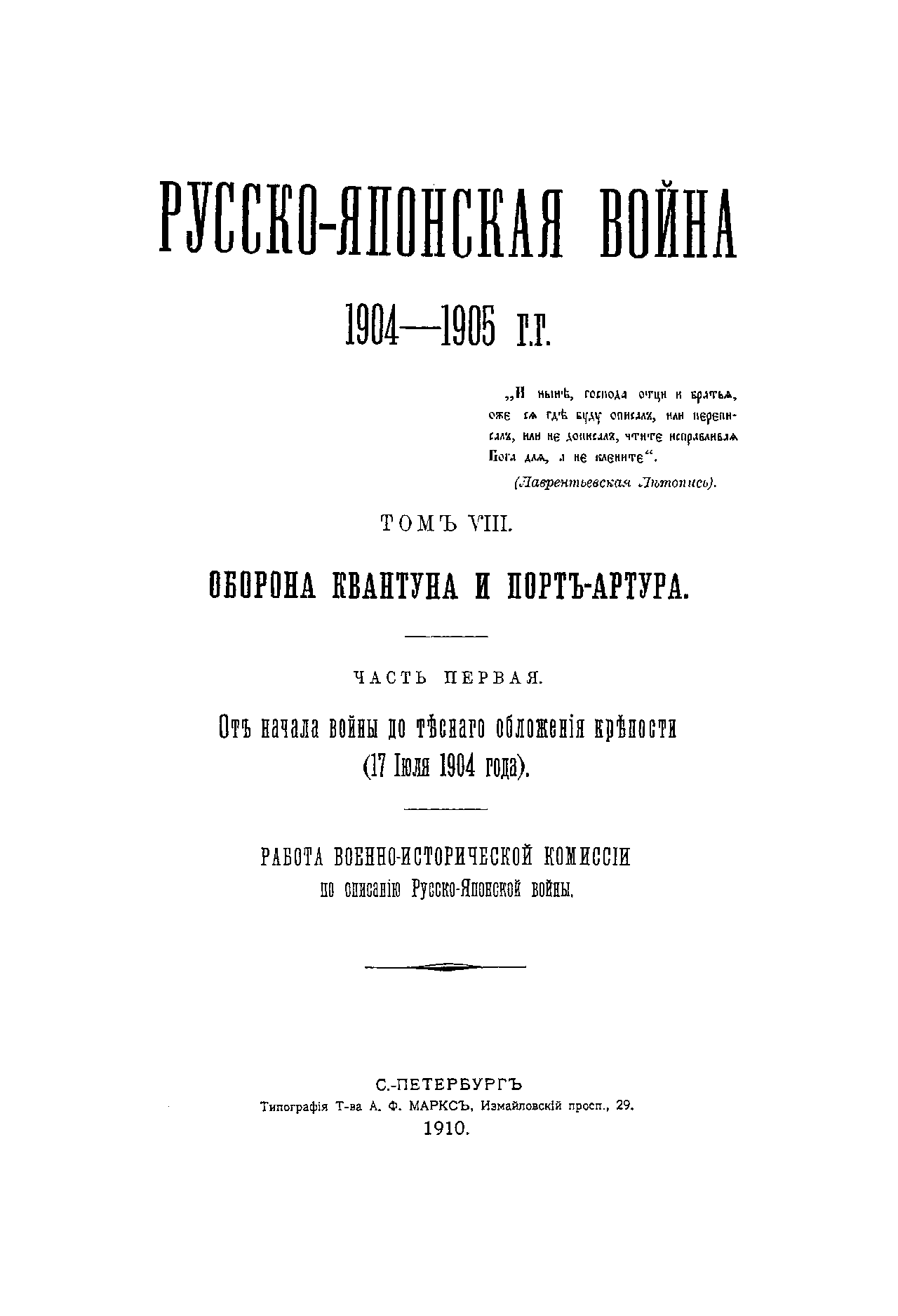 Русско-Японская война 1904-1905 гг. Том VIII. Оборона Квантуна и Порт-Артура. Часть первая. От начала войны до тесного обложения крепости (17 Июля 1904 года)