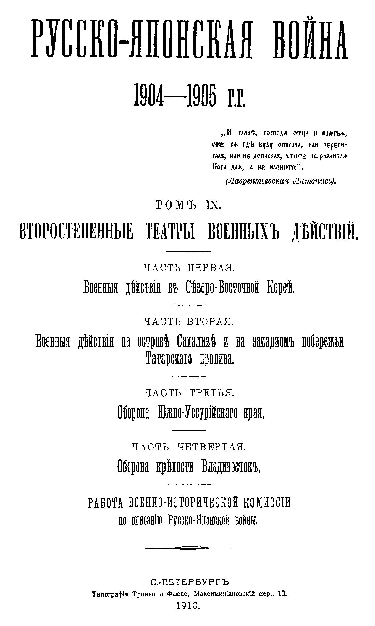 Русско-Японская война 1904-1905 гг. Томъ IX. Второстепенные театры военныхъ дѣйствiй. Часть первая. Военныя дѣйствiя в Сѣверо-Восточной Кореѣ. Часть вторая. Военныя дѣйствiя на островѣ Сахалинѣ и на западномъ побережьи Татарскаго пролива. Часть третья. Оборона Южно-Уссурiйскаго края. Часть четвертая. Оборона крѣпости Владивостокъ