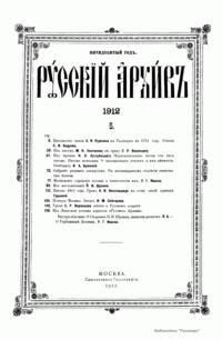 «Русский архив» — ежемесячный историко-литературный журнал, издававшийся в Москве с 1863 по 1917 год. Создателем и продолжительные годы редактором журнала был П. И. Бартенев – историк, археограф, библиограф. Этот журнал называли «живой картиной былого», поскольку он содержал преимущественно публикации неизданных мемуарных, эпистолярных, литературно-художественных и ведомственных документальных материалов, освещавших культурную и политическую историю России в XVIII и XIX вв. По числу опубликованных источников «Русский архив» стоит на первом месте среди русских исторических журналов.