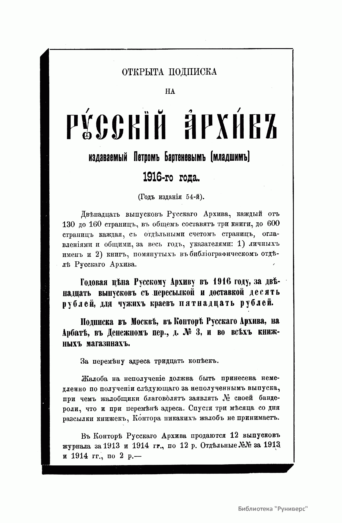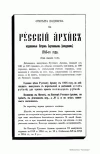 «Русский архив» — ежемесячный историко-литературный журнал, издававшийся в Москве с 1863 по 1917 год. Создателем и продолжительные годы редактором журнала был П. И. Бартенев – историк, археограф, библиограф. Этот журнал называли «живой картиной былого», поскольку он содержал преимущественно публикации неизданных мемуарных, эпистолярных, литературно-художественных и ведомственных документальных материалов, освещавших культурную и политическую историю России в XVIII и XIX вв. По числу опубликованных источников «Русский архив» стоит на первом месте среди русских исторических журналов.