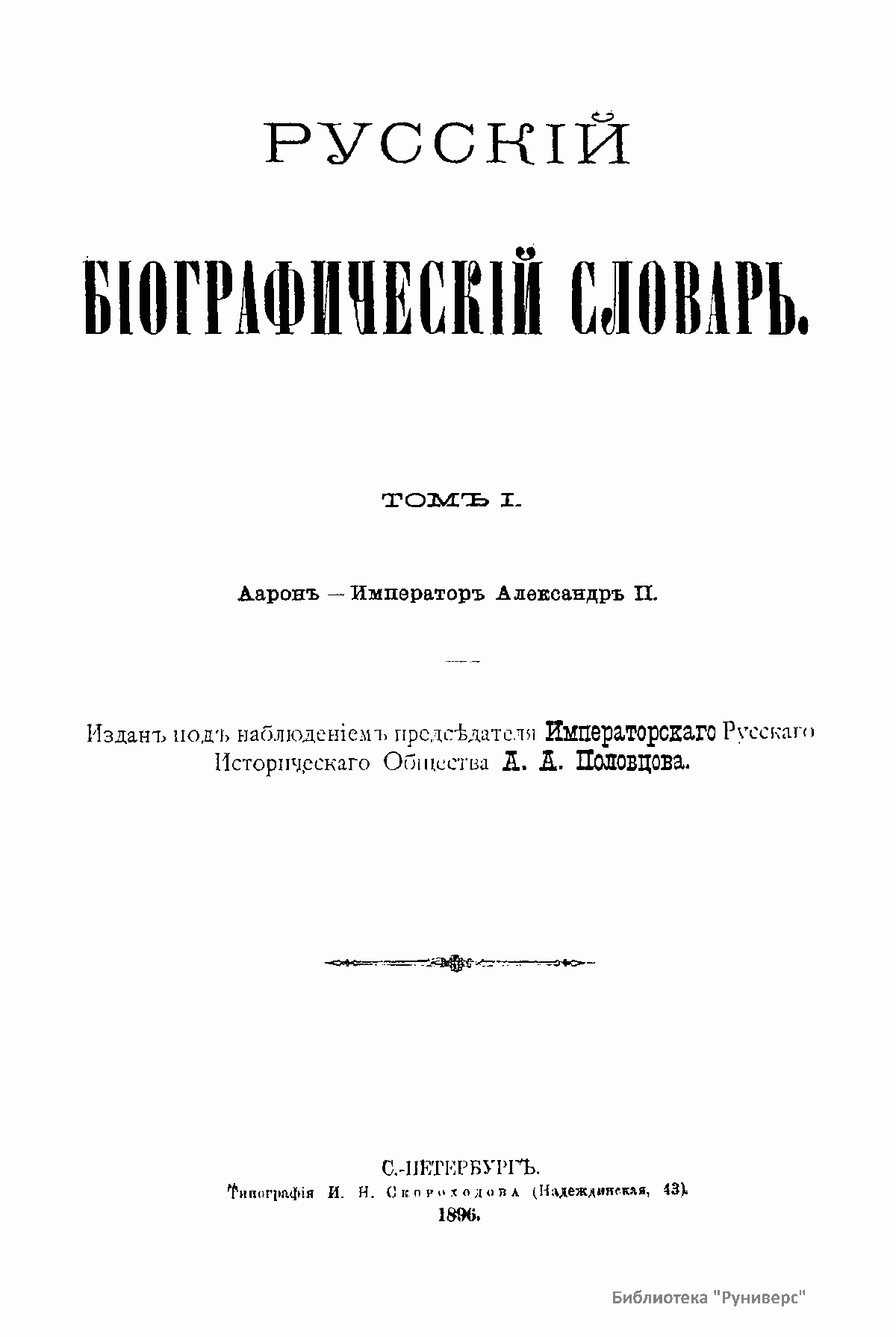 Русский биографический словарь (25 томов), в состав которого вошли имена и биографии виднейших деятелей государства, науки, просвещения и церковных деятелей, издавался Русским историческим обществом с 1896 по 1918 год. Русское историческое общество было основано в Санкт-Петербурге в 1866 году по инициативе известных отечественных историков, военных и государственных деятелей и ставило своей целью всесторонне содействовать развитию русского национального исторического просвещения. Общество пользовалось покровительством и финансовой поддержкой императорской семьи. Его деятельность носила археографический характер. Члены общества собирали исторические документы, которые публиковались в «Сборниках русского исторического общества». Всего до 1920 года (в этом году общество было закрыто) вышло 148 томов. Таким образом в научный оборот было введено большое количество документов XVIII – начала XIX века, ранее недоступных для исследователей, так как документальные материалы архивов царской России были для историков закрыты. К изданию русского биографического словаря, материалы которого до сих пор являются интереснейшим источником для исследователей, Общество приступило по инициативе императора Александра III. Тома биографического словаря выходили не в алфавитном порядке. С 1896 по 1909 год редактором словаря был руководитель Русского исторического общества, промышленник, член Сената Александр Александрович Половцев. Он выпустил 1, 2, 3, 6, 8, 12, 13, 14, 15, 18, 19, 21 и 22-й тома, поэтому этот словарь известен еще как «словарь Половцева».