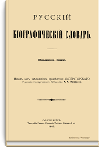 Русский биографический словарь (25 томов), в состав которого вошли имена и биографии виднейших деятелей государства, науки, просвещения и церковных деятелей, издавался Русским историческим обществом с 1896 по 1918 год. Русское историческое общество было основано в Санкт-Петербурге в 1866 году по инициативе известных отечественных историков, военных и государственных деятелей и ставило своей целью всесторонне содействовать развитию русского национального исторического просвещения. Общество пользовалось покровительством и финансовой поддержкой императорской семьи. Его деятельность носила археографический характер. Члены общества собирали исторические документы, которые публиковались в «Сборниках русского исторического общества». Всего до 1920 года (в этом году общество было закрыто) вышло 148 томов. Таким образом в научный оборот было введено большое количество документов XVIII – начала XIX века, ранее недоступных для исследователей, так как документальные материалы архивов царской России были для историков закрыты. К изданию русского биографического словаря, материалы которого до сих пор являются интереснейшим источником для исследователей, Общество приступило по инициативе императора Александра III. Тома биографического словаря выходили не в алфавитном порядке. С 1896 по 1909 год редактором словаря был руководитель Русского исторического общества, промышленник, член Сената Александр Александрович Половцев. Он выпустил 1, 2, 3, 6, 8, 12, 13, 14, 15, 18, 19, 21 и 22-й тома, поэтому этот словарь известен еще как «словарь Половцева».