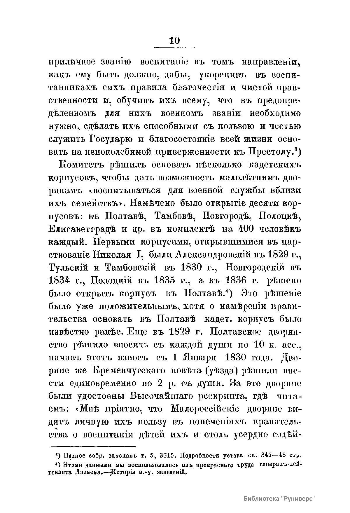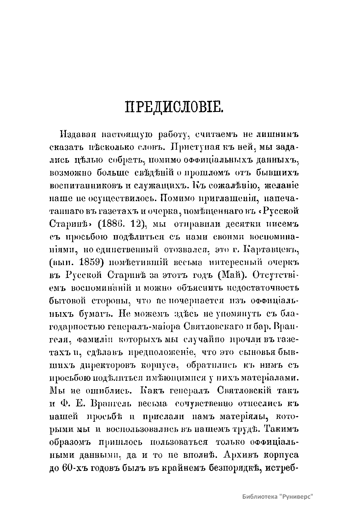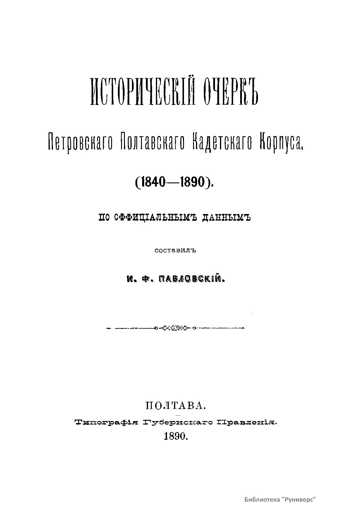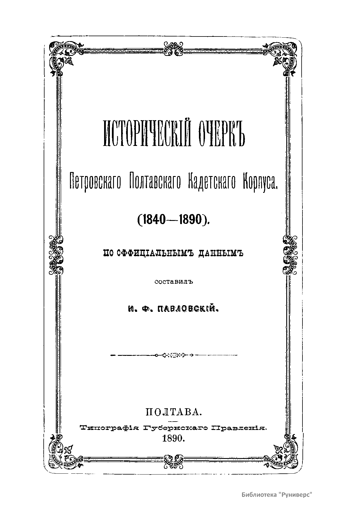 Книга И.Ф. Павловского «Исторический очерк Петровского Полтавского кадетского корпуса. 1840 - 1890», изданная в 1890 г. в Москве посвящена полувековой истории Петровского Полтавского кадетского корпуса, основанного в 1840 г. императором Николаем I, который в своем напутствии писал: «Я уверен, кадеты, что сей новый знак внимания Нашего молодым дворянам, посвятившим себя воинскому поприщу, усугубят в каждом вас пламенную ревность сделаться верным слугой Царю Вашему и Отечеству». Значительную долю описания жизни Корпуса занимают характеристики его руководителей, их усилия по усовершенствованию организации и методов преподавания, а также рассказы о выпускниках училища - участниках многих войн 2-й половины XIX