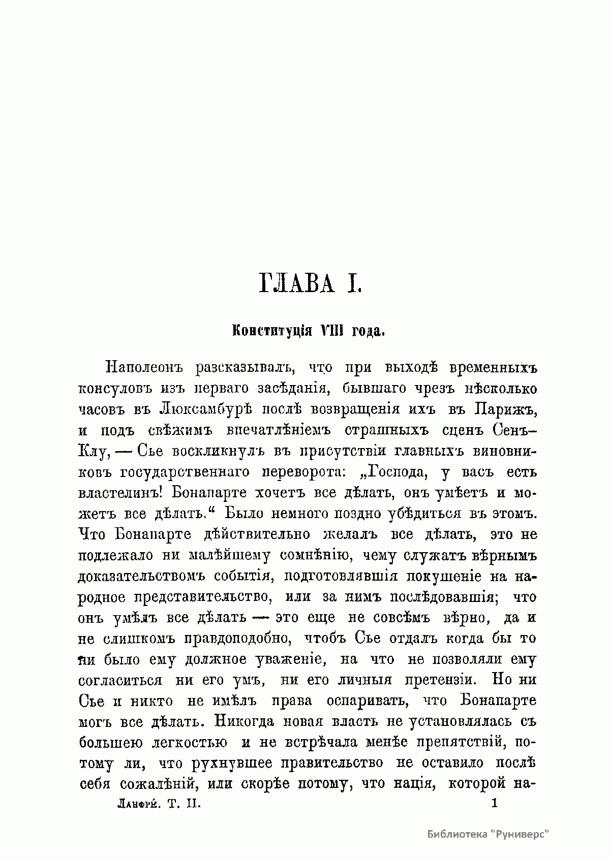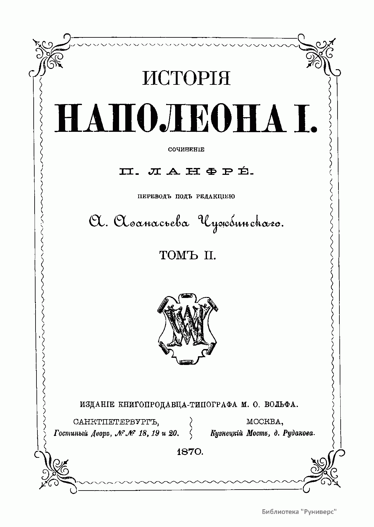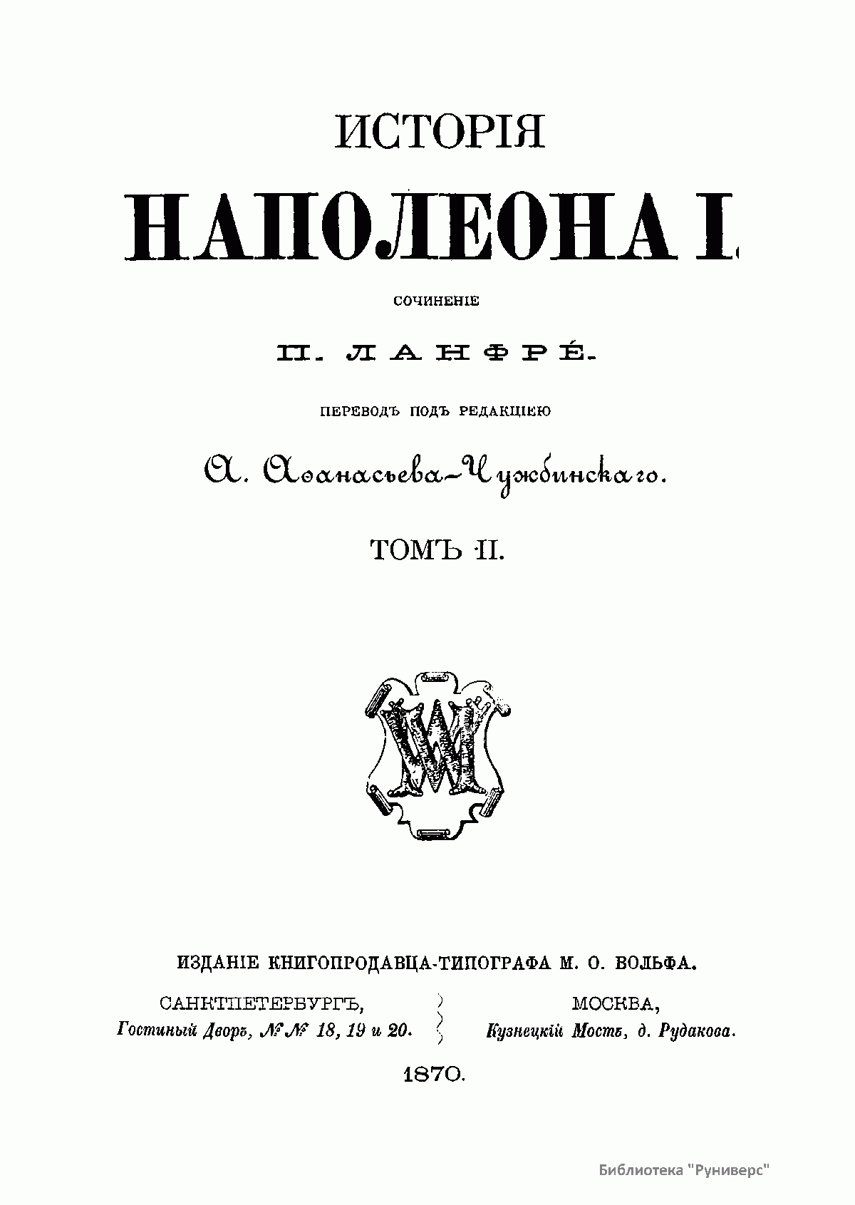 Пятитомная «История Наполеона I» французского историка середины XIX в. Пьера Ланфре (1828 – 1877 гг.) изданная в Санкт-Петербурге в 1870 – 1877 гг. охватывает период с рождения Наполеона Бонапарта до осложнения русско-французских отношений в 1811 г. и подготовки военной кампании в России. В ней содержится подробное изложение событий Наполеоновских войн, сопровождавшееся критической оценкой деятельности Наполеона I. Данная работа П. Ланфре незакончена в связи со смертью автора.