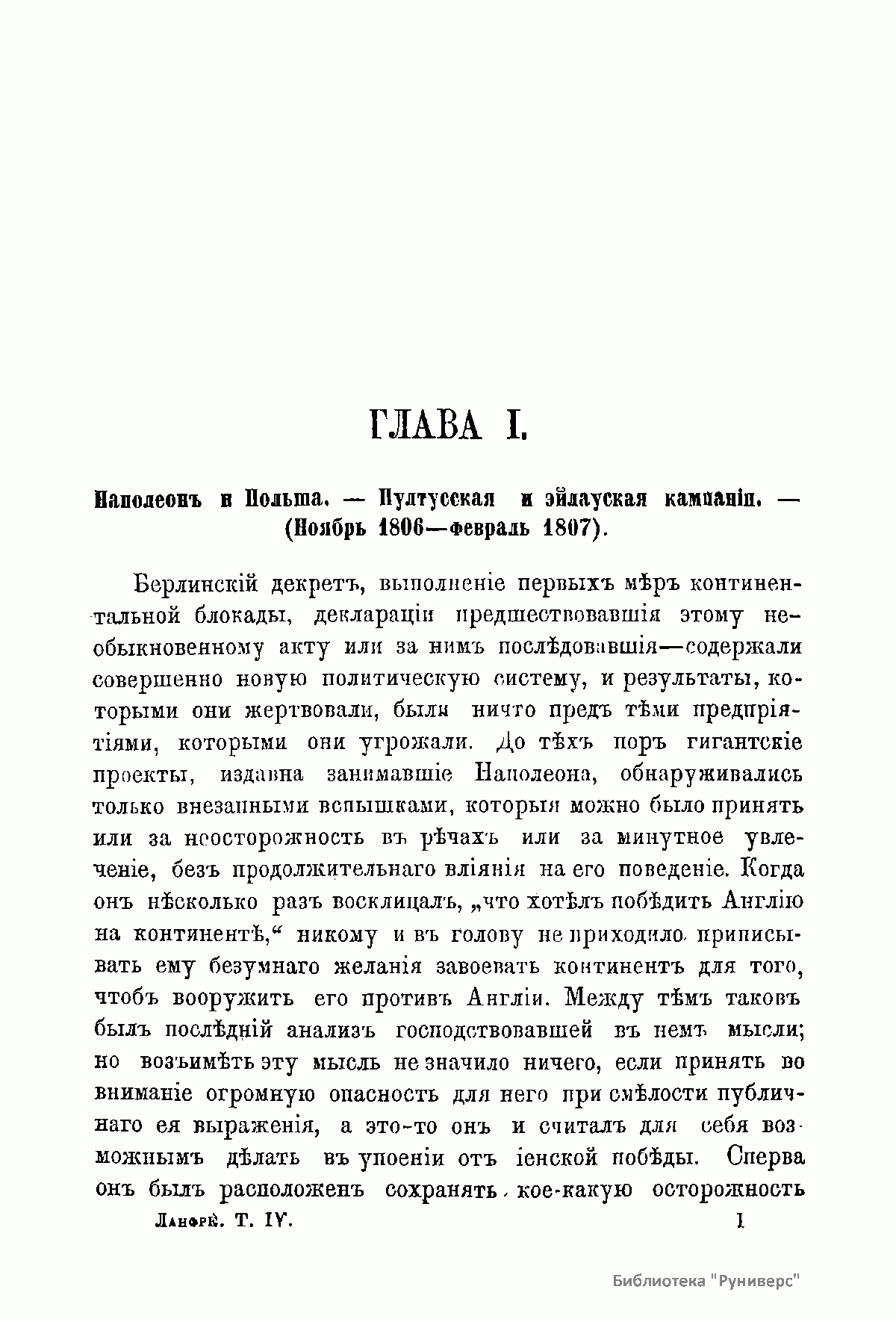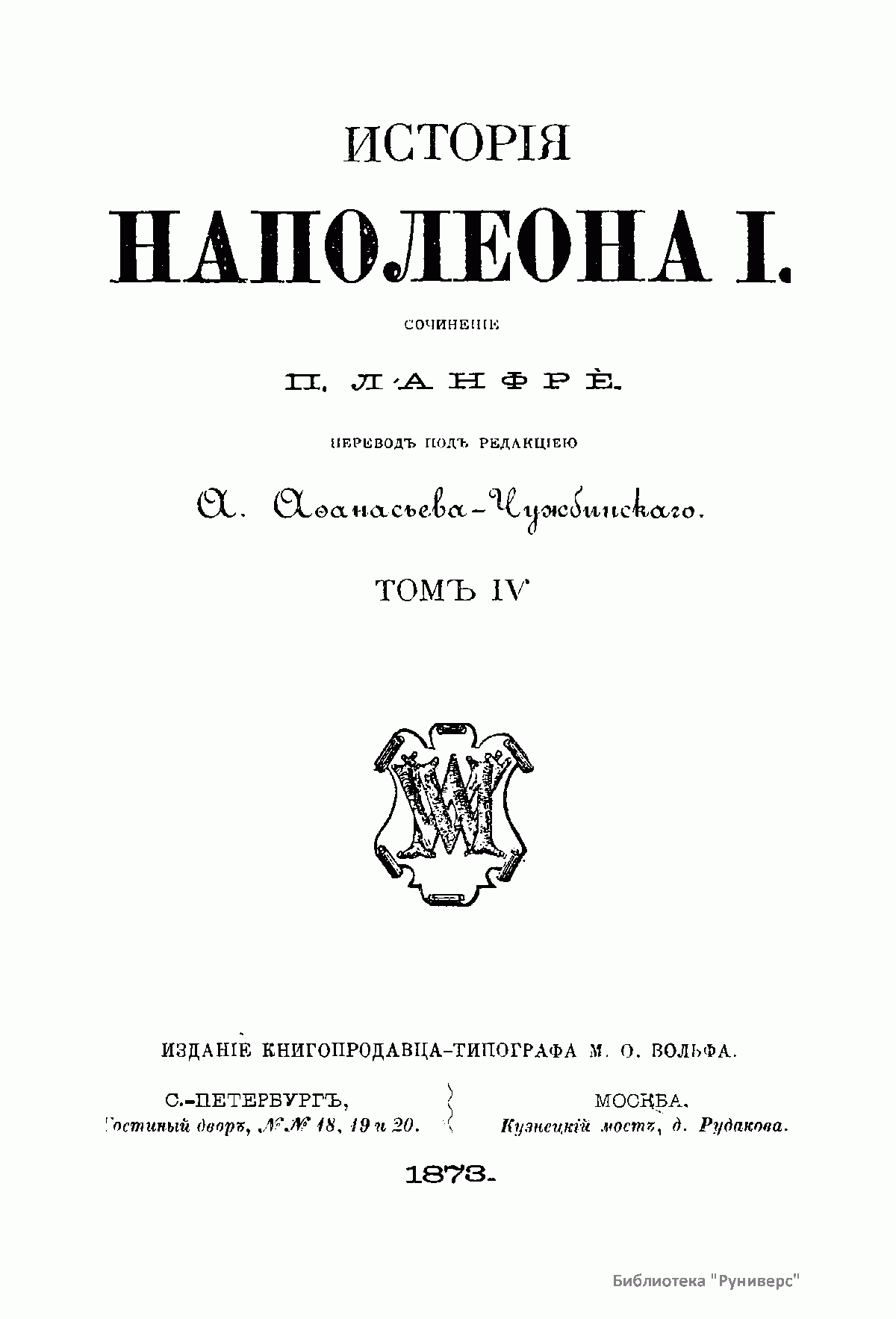 Пятитомная «История Наполеона I» французского историка середины XIX в. Пьера Ланфре (1828 – 1877 гг.) изданная в Санкт-Петербурге в 1870 – 1877 гг. охватывает период с рождения Наполеона Бонапарта до осложнения русско-французских отношений в 1811 г. и подготовки военной кампании в России. В ней содержится подробное изложение событий Наполеоновских войн, сопровождавшееся критической оценкой деятельности Наполеона I. Данная работа П. Ланфре незакончена в связи со смертью автора.