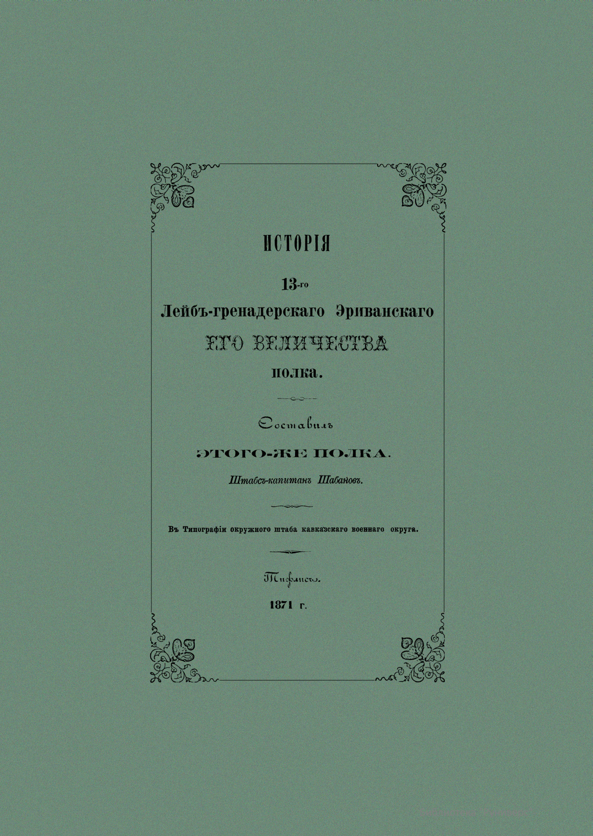 Эриванский 13-й лейб-гренадерский полк — старейший и наиболее титулованный полк русской армии. История полка началась в 1642 г., когда по указу царя Михаила Федоровича был сформирован Московский выборный солдатский Бутырский полк из числа московских стрельцов. Полк веками достигал своей боевой славы на полях битвы за родное отечество. Первым летописцем истории полка стал штабс-капитан этого полка Дмитрий Федорович Шабанов. Для подготовки данного издания автор использовал материалы архивов главного кавказского штаба, канцелярии кавказского наместника, а также полкового архива, хранившего текущую переписку с 1811 г. Боевые действия и события внутренней жизни полка изложены в хронологическом порядке. В повествовании название полка сохранено то, под каким он действовал в течение описываемой эпохи.