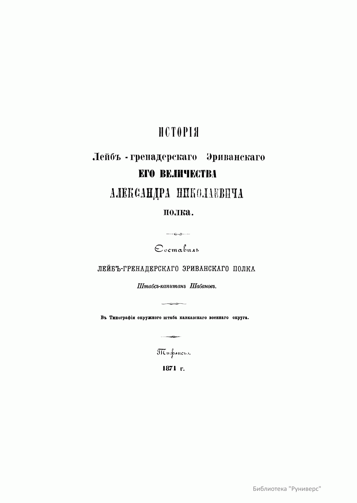 Исторiя 13-го Лейбъ-гренадерскаго Эриванскаго Его Величества полка. Часть III-я. Отъ сформирования полка до его прибытiя въ Манглисъ. 1853-1870