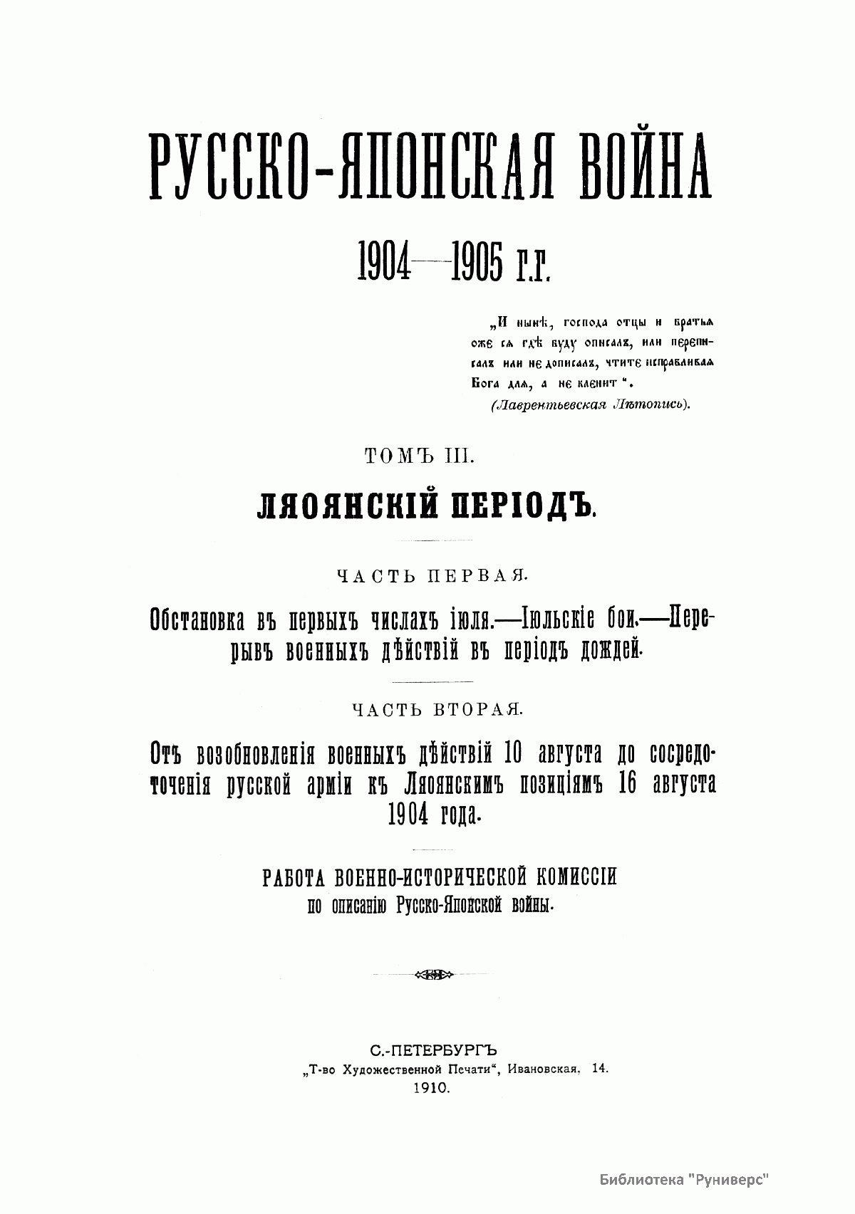Русско-Японская война 1904-1905 гг. Томъ III. Ляоянскiй периодъ. Часть первая. Обстановка въ первыхъ числахъ iюля. - Iюльскiе бои. - Перерывъ военныхъ дѣйствiй въ перiод дождей. Часть вторая. Отъ возобновленiя военныхъ дѣйствiй 10 августа до сосредоточенiя русской армiи къ Ляоянскимъ позицiямъ 16 августа 1904 года