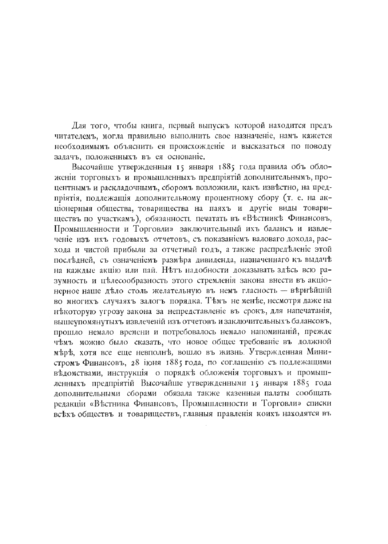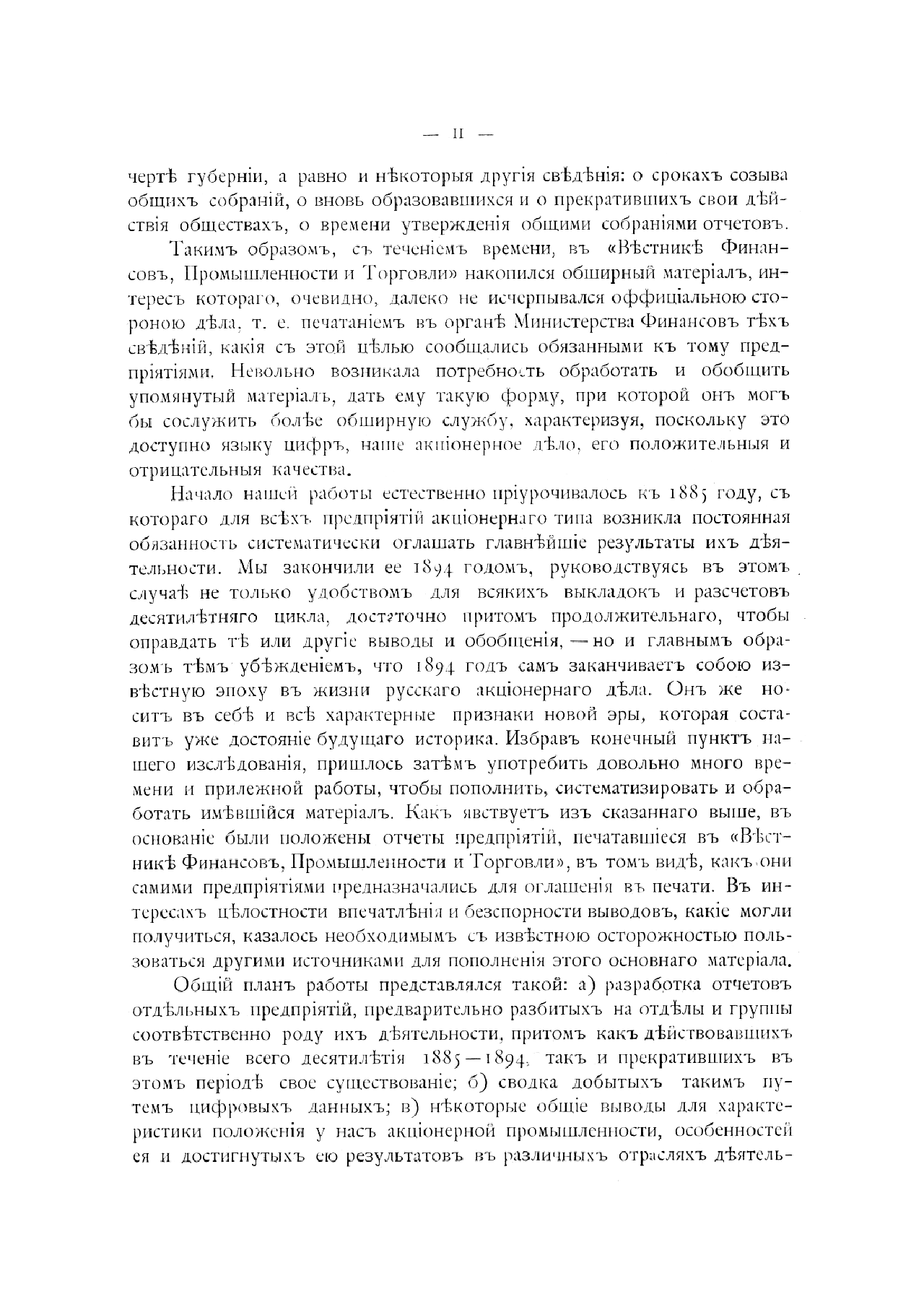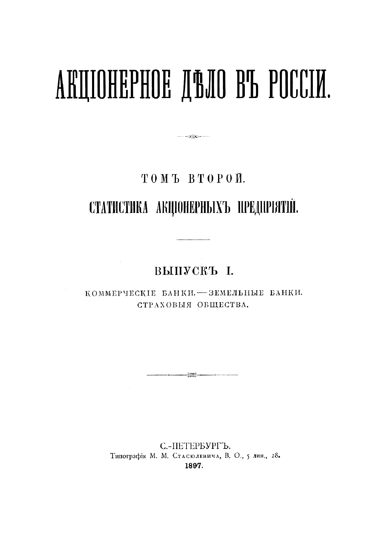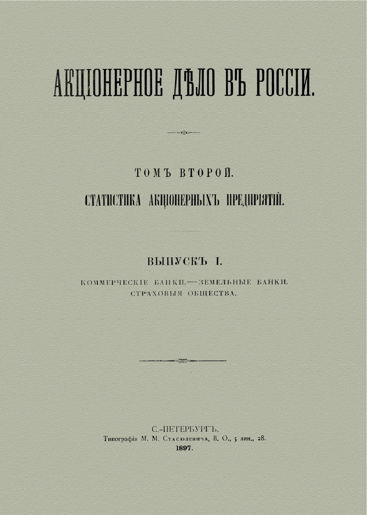 Работа над собранным в книге материалом началась в 1885-м и была завершена в 1894 году. Все предприятия акционерного типа, согласно утвержденным в 1885 году правилам об обложении допол-нительными сборами, были обязаны систематически оглашать результаты их деятельности. Эти же правила обязали казенные палаты сообщать редакции «Вестника финансов» списки всех обществ и товариществ, главные правления которых находятся в черте губерний, а также другие сведения. Таким образом, в основу книги вошли отчеты предприятий, печатавшиеся в «Вестнике финансов», в том виде, как их предоставляли предприятия для оглашения в печати. Помимо статистических сведений, собранных в семи выпусках второго тома, планировалось издать отельный труд (первый том) с общими выводами и историческим очерком возникновения и развития акционерного дела в России.