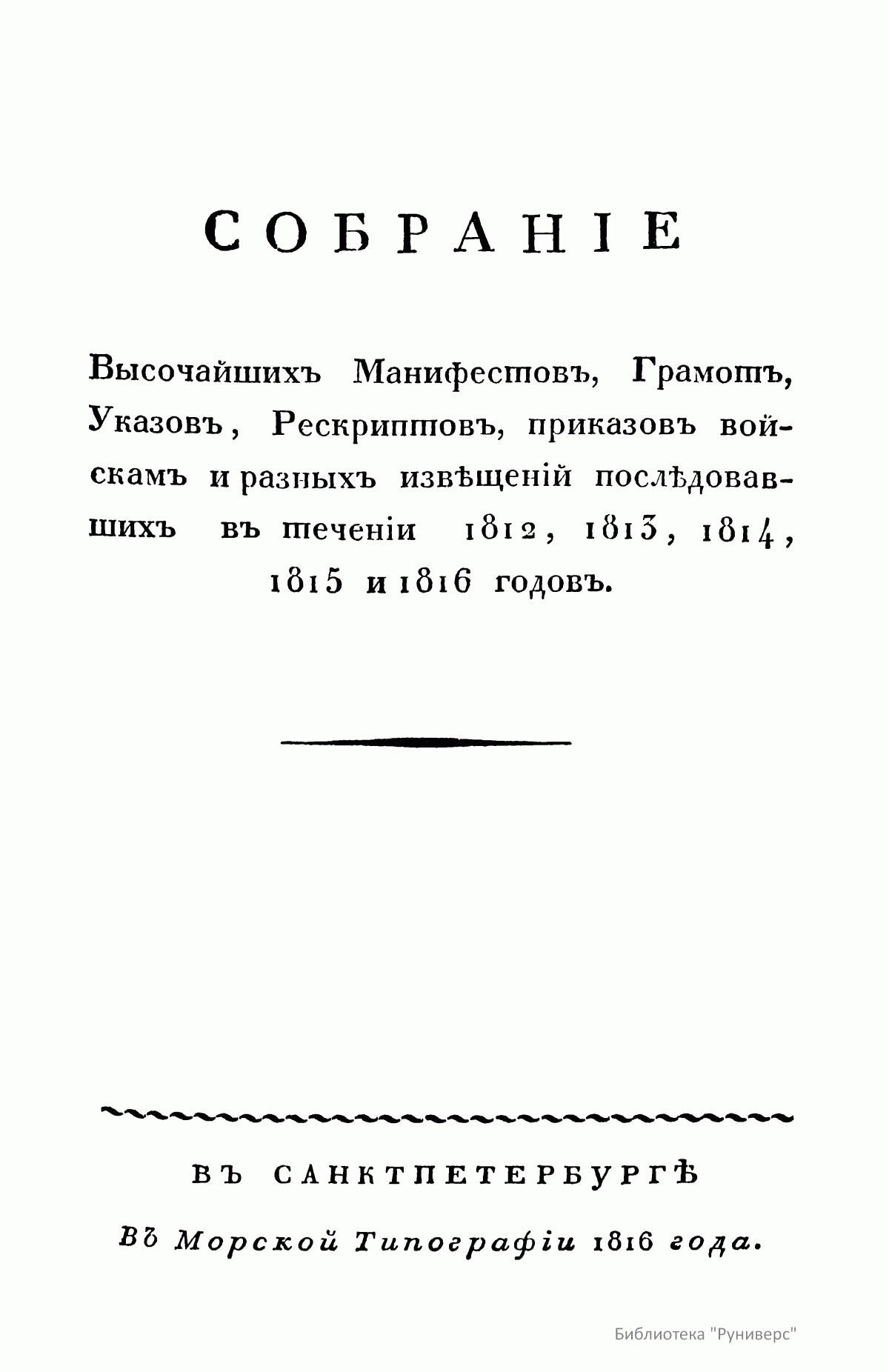Собранiе Высочайшихъ манифестовъ, Грамотъ, Указовъ, Рескриптовъ, приказовъ войскамъ и разныхъ извѣщенiй послѣдовавшихъ въ теченiи 1812, 1813, 1814, 1815 и 1816 годовъ