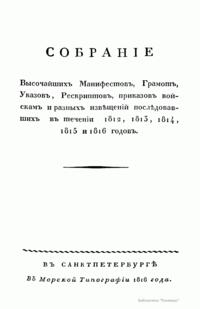 Собрание Высочайших манифестов, Грамот, Указов, Рескриптов, приказов войскам и разных извещений последовавших в течении 1812, 1813, 1814, 1815 и 1816 годов