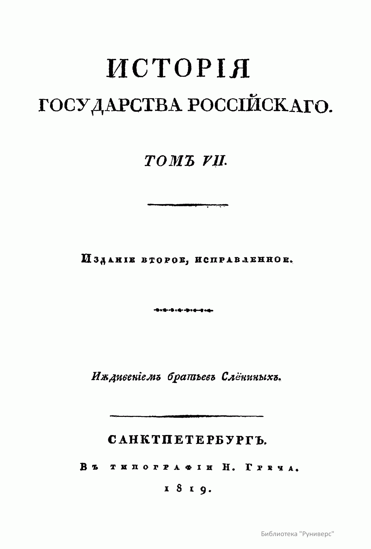 В 1816 году он выпустил первые восемь томов «Истории государства Российского», трёхтысячный тираж которых разошелся в течение месяца. В последующие годы вышли еще три тома «Истории», появился ряд переводов её на главнейшие европейские языки. Тенденциозно-монархическое освещение русского исторического процесса сблизило Карамзина с двором и царем, поселившим его подле себя в Царском Селе. Незаконченный XII том был издан уже после его смерти.