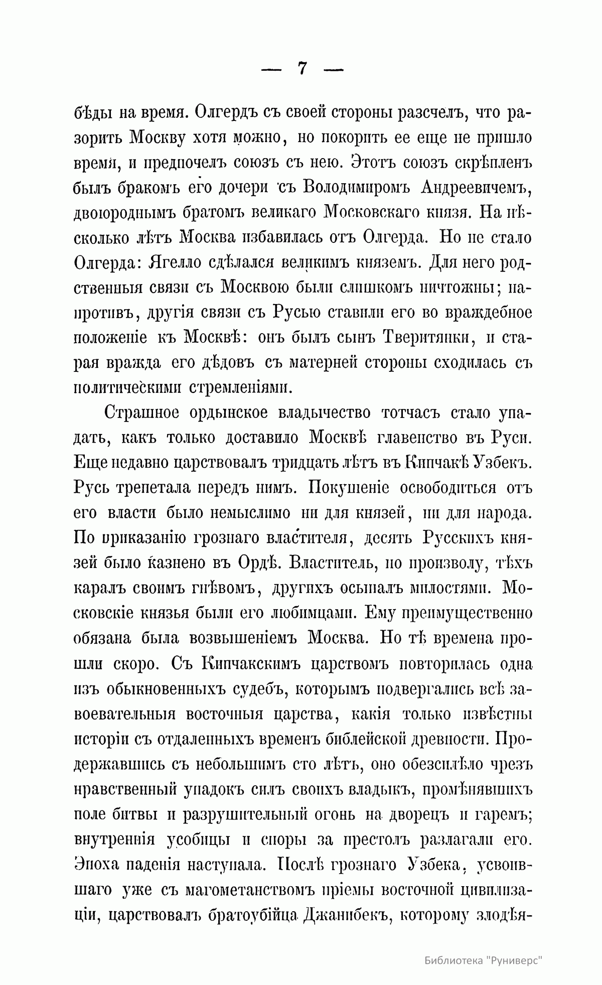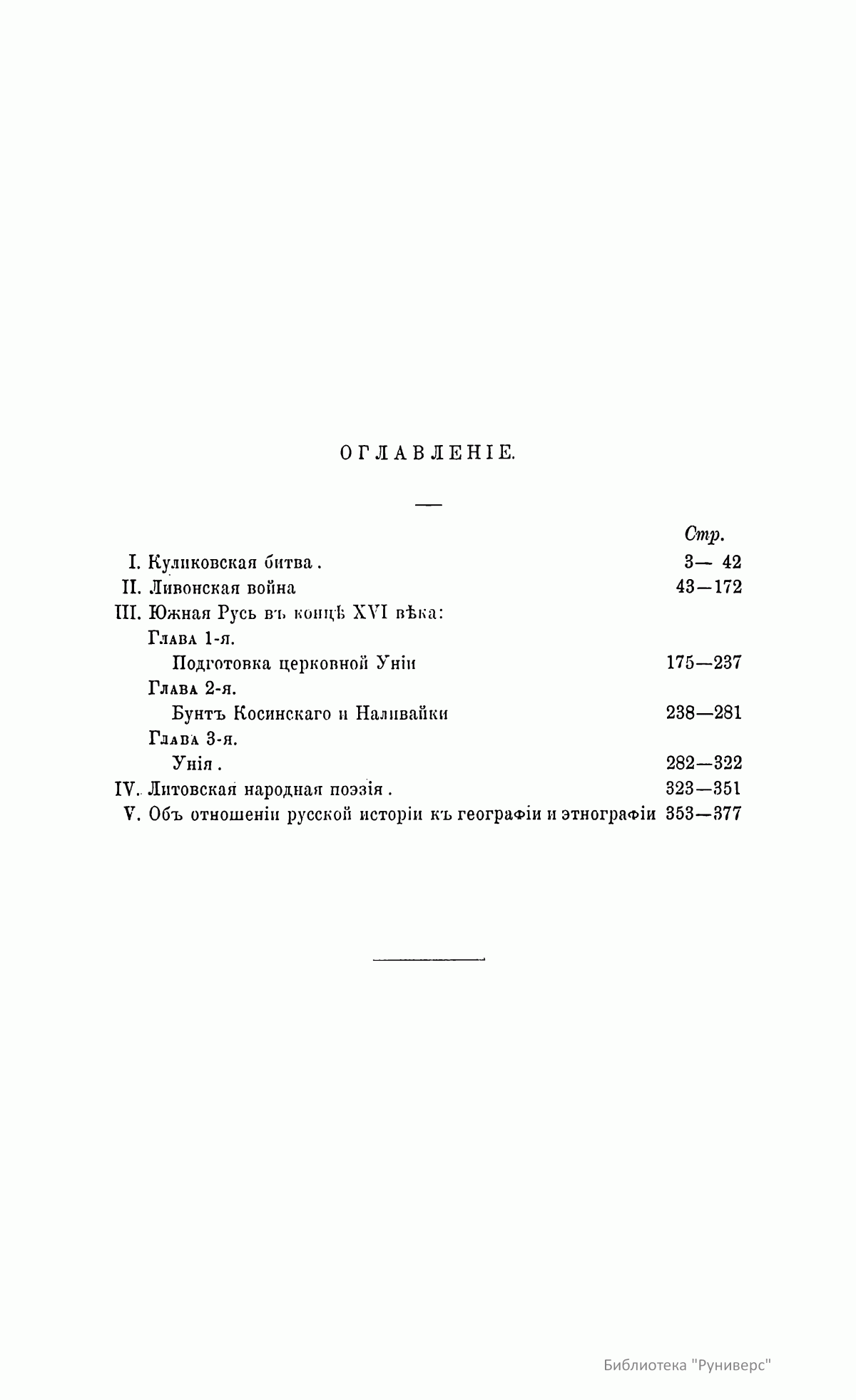 Перед читателем прижизненное издание трудов Н. И. Костомарова, в котором удачно соединялись историк-мыслитель и художник, что обеспечило ему не только одно из первых мест в ряду русских историков, но и наибольшую популярность среди читающей публики. Глубоко вдумываясь, почти вживаясь в изучаемую им старину, он воспроизводил ее в своих работах такими яркими красками, в таких выпуклых образах, что она надолго оставалась в памяти читателя. В первых трех томах и в двенадцатом томе опубликованы различные статьи. 1 – «Мысли о федеративном начале древней Руси»; «Черты народной южнорусской истории»; «Две русские народности»; «Мистическая повесть о Нифонте. Памятник русской литературы»; «Легенда о кровосмесителе»; «О значении Великого Новгорода»; «Должно ли считать Бориса Годунова основателем крепостного права?»; «Великорусские религиозные вольнодумцы в XVI веке. – Матвей Башкин и его соучастник Феодосий Косой»; «Иван Сусанин. Историческое исследование». 2 – «Иван Свирговский, украинский казацкий гетман XVI века»; «Гетманство Выговского»; «Бунт Стеньки Разина»; «По поводу мыслей светского человека, о книге «Сельское духовенство». 3 – «Куликовская битва»; «Ливонская война»; «Южная Русь в конце XVI века»; «Литовская народная поэзия»; «Об отношении русской истории к географии и этнографии». 12 – «Начало единодержавия в Древней Руси»; «Гетманство Юрия Хмельницкого»; «Церковно-историческая критика в XVII веке»; «История раскола у раскольников»; «Воспоминания о молоканах». Четвертый, пятый и шестой тома посвящены Смутному времени московского государства в начале XVII столетия. Седьмой и восьмой – истории Новгорода, Пскова и Вятки во время удельно-вечевого уклада. Девятый, десятый и одиннадцатый – Богдану Хмельницкому.