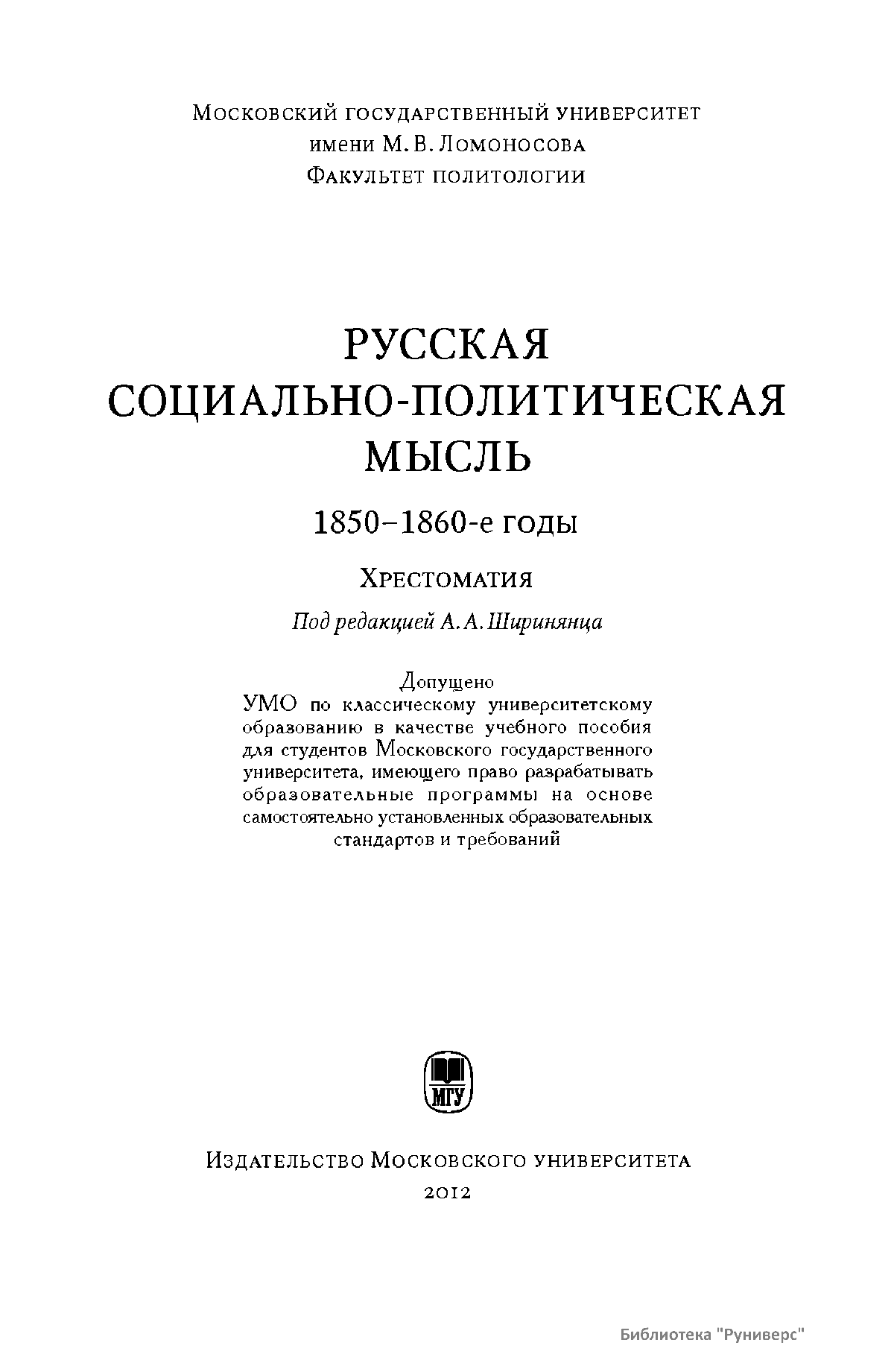 В хрестоматию, составленную в соответствии с программой учебного курса «История социально-политических учений России», читаемого на факультете политологии Московского государственного университета имени М.В. Ломоносова, вошли произведения