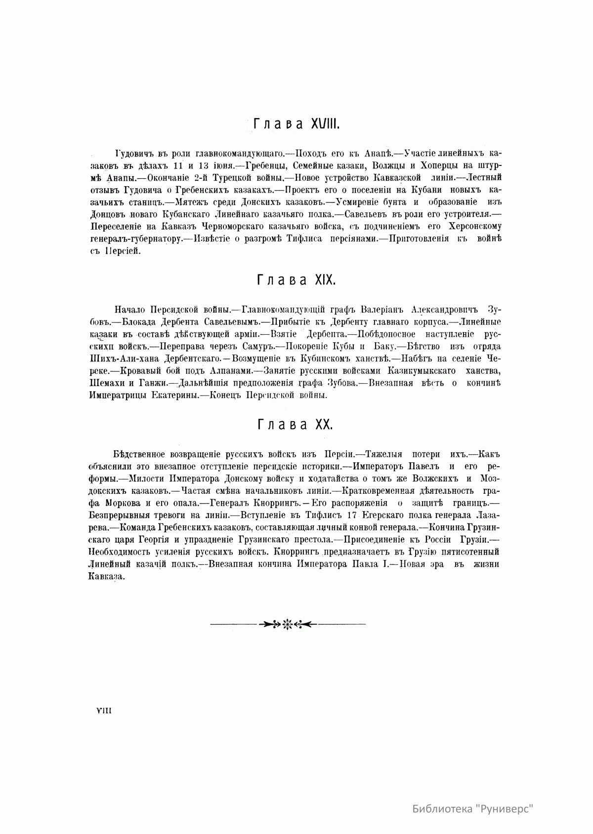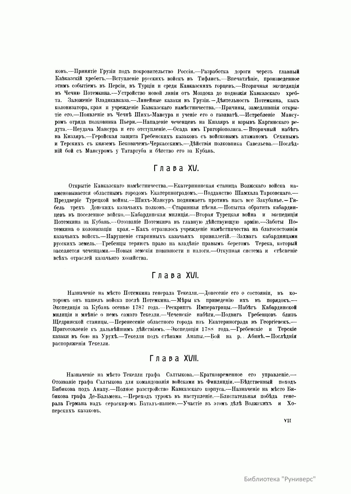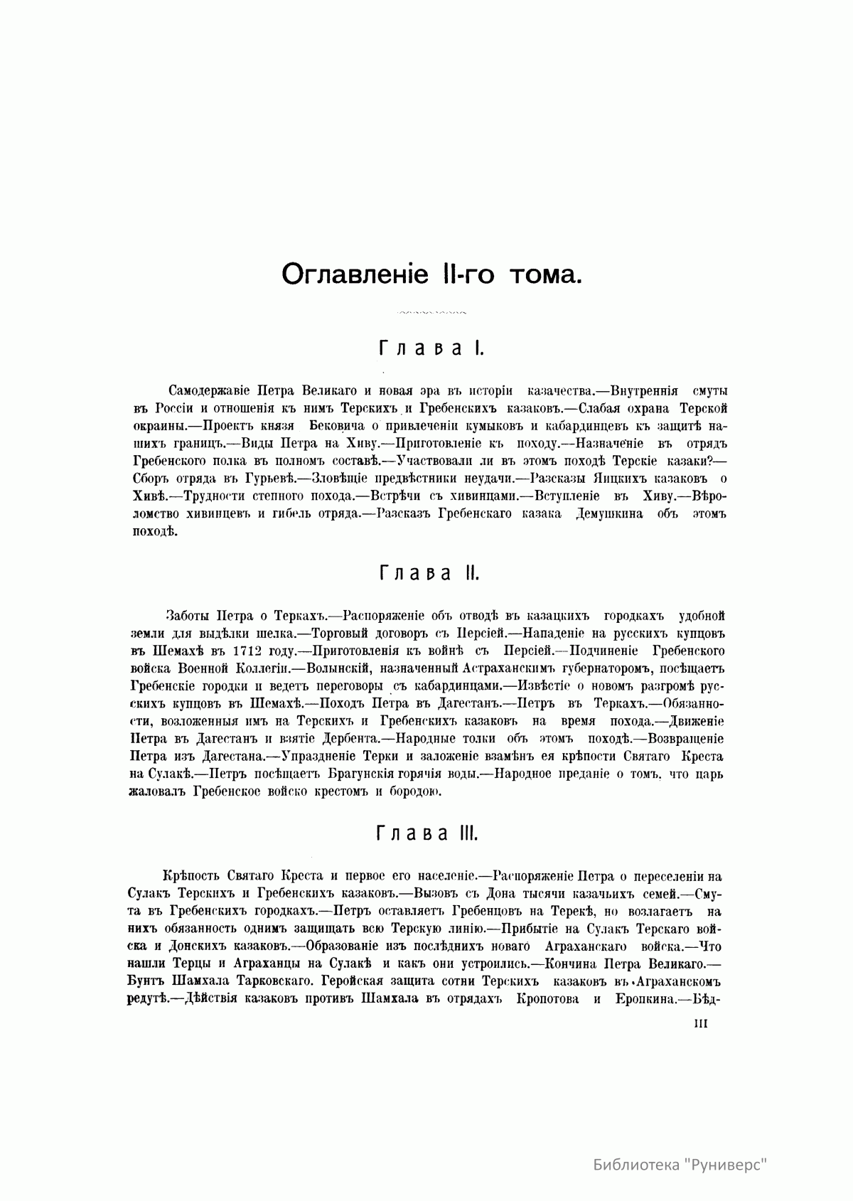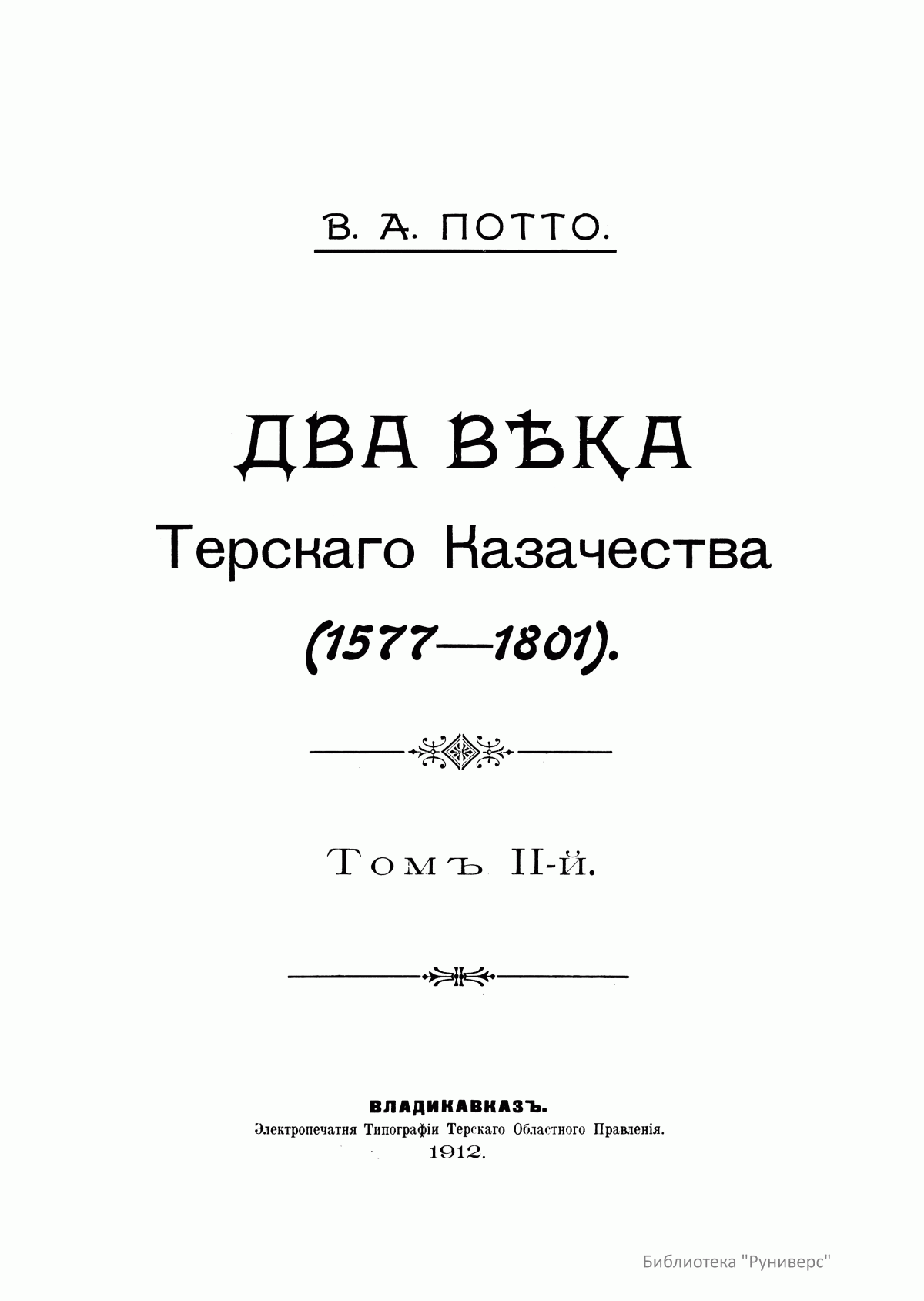 Труды выдающегося русского венного историка, генерал-лейтенанта Василия Александровича Потто (1836–1911), освещающие этапы прихода и становления русской власти в кавказском регионе, историю многолетних кавказских войн и развития казачества, обогатили русскую военную литературу и по праву считаются одними из лучших произведений кавказской тематики. Многие годы В. А. Потто собирал разрозненные документы, военные хроники и архивные материалы, чтобы отобразить общую картину драматических событий, определивших особую роль кавказских войн в истории российского государства. В 1896 г. В. А. Потто был назначен начальником военно-исторического отдела при Штабе Кавказского военного округа, где значительно расширил свою издательскую деятельность. Под его редакцией вышли «Утверждение русского владычества на Кавказе» в 8 томах, «Кавказский сборник», издававшийся в Тифлисе в 1876–1912 гг., «Памятники времен Кавказской войны», «Исторический очерк Кавказских войн от их начала до присоединения Грузии к России». «Два века терского казачества» последнее произведение В. А. Потто. В этом исследовании прослеживается роль терского казачества в истории Российского государства. Автор планировал подготовить трехтомное сочинение, но смерть помешала ему закончить задуманное, и в 1912 г. в свет вышли первые два тома издания.