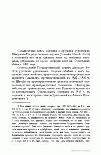 Русские документы Стокгольмского государственного архива на 1885 год состояли из четырех коллекций: делагардиевской (Яков Делагарди – шведский полководец, вывезший документы из Новгорода в начале XVII столетия), заключавшей до 500 свитков и до ста приказных книг и тетрадей; брагегюзской, содержавшей 17 разной величины столбцов; дипломатической, составленной из актов XV, XVI и XVII столетий; собрания 109 государственных актов и царских грамот. Эта коллекция в то время полностью не была систематизирована и описана. Документы настоящей публикации относятся к коллекции Делагарди. Здесь описано 47 столбцов (стр.12), и 118 приказных книг и тетрадей (стр. 41). В приложении к описанию столбцов (стр. 26) дается текст 19 грамот.