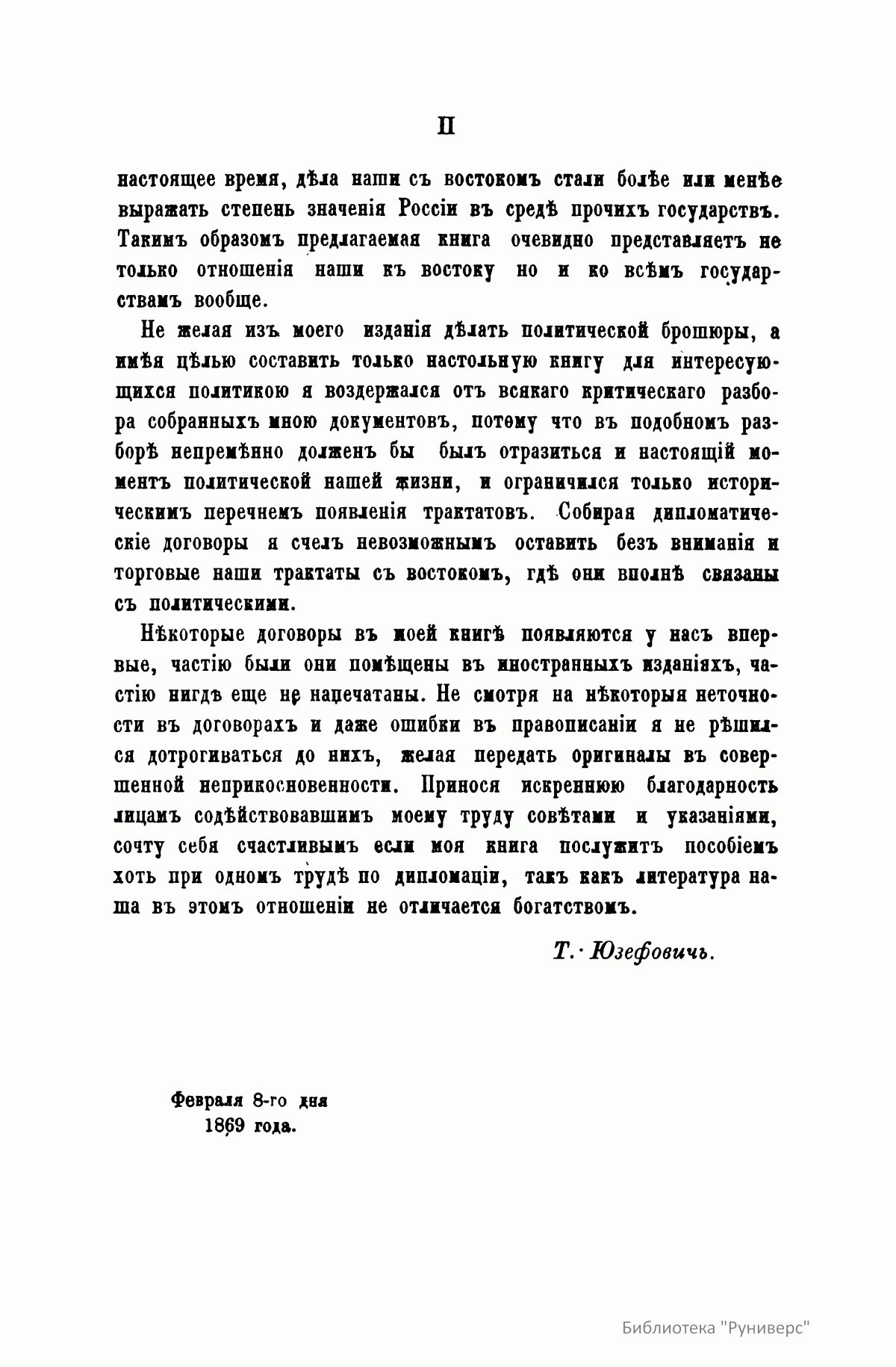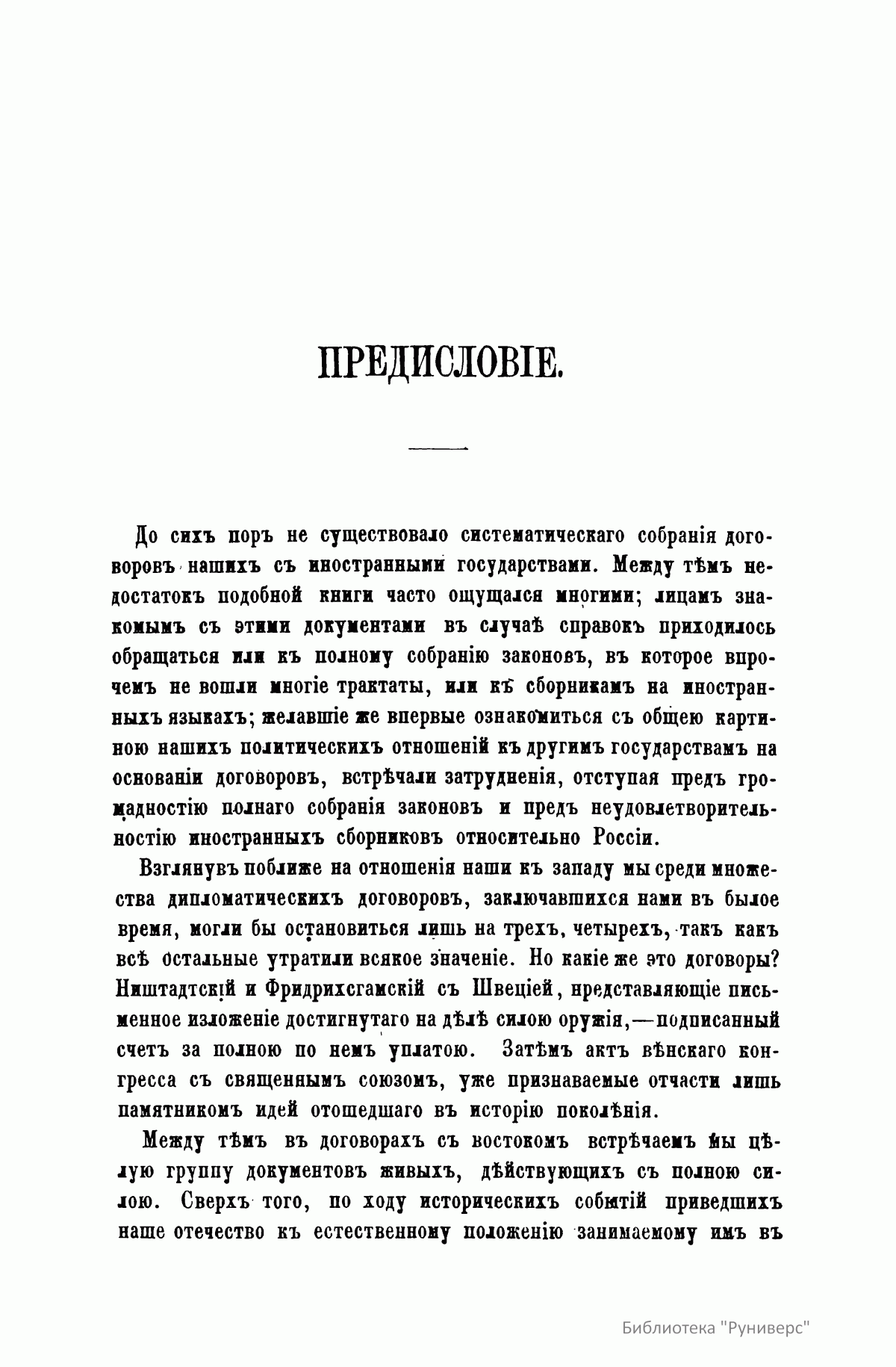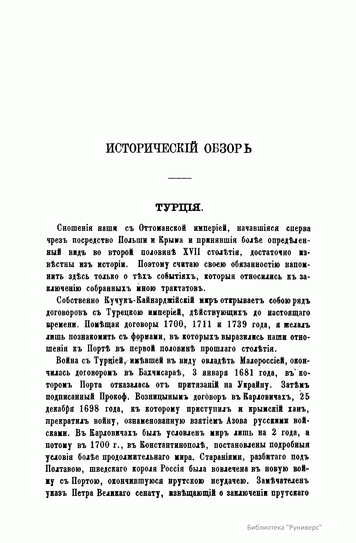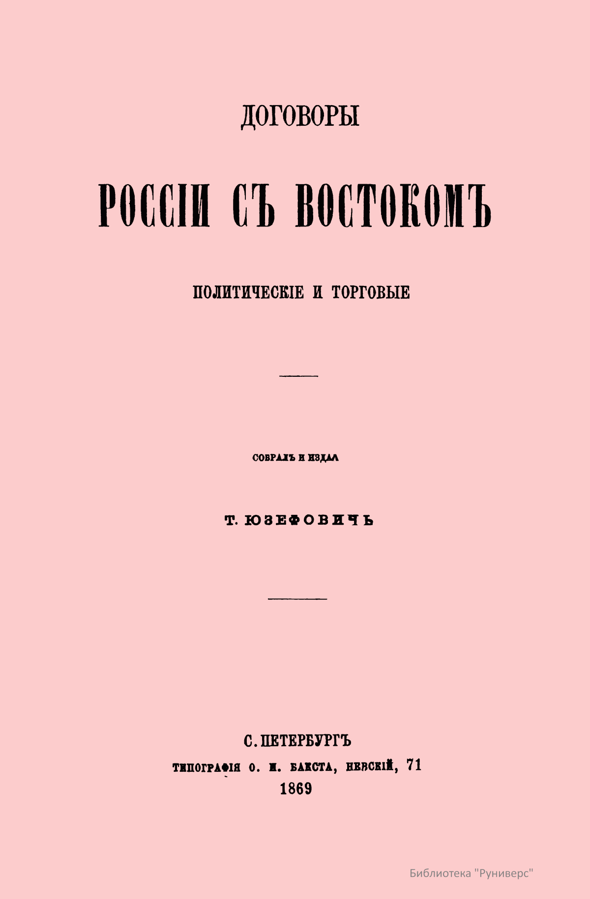 Цель настоящего издания – составить настольную книгу для интересующихся политикой. Автор воздержался от критического разбора предлагаемых документов и ограничился только историческим перечнем появления трактатов. Собирая дипломатические договоры, он счел невозможным оставить без внимания и торговые, так как они между собой тесно связаны. В книге опубликовано двадцать договоров с Турцией, заключенных в период с 1700-го по 1856 год (стр. 1); шесть договоров с Персией – 1723 – 1828 (стр. 185); девять договоров с Китаем – 1689 – 1862 (стр. 231); три договора с Японией 1855 – 1867 (стр. 276). Публикацию документов предваряет исторический обзор событий, которые относились к заключению собранных трактатов (стр. III – XXII).