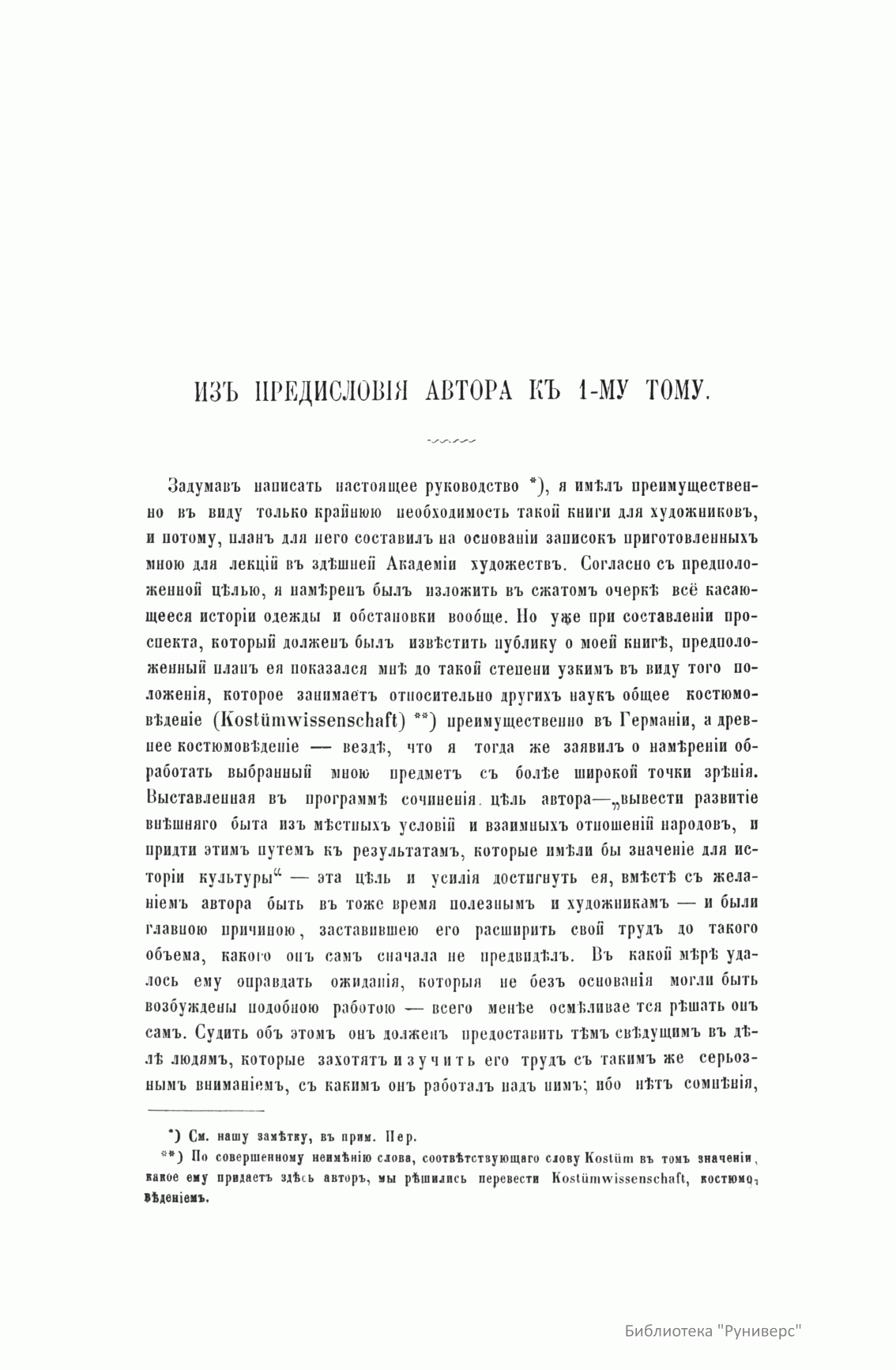 Сочинение Германа Вейса, профессора и преподавателя Берлинской Академии художеств, адресовано прежде всего художникам, а также всем интересующимся историей культуры разных народов. Книга состоит из трех частей. Первый том посвящен древнему миру (Часть первая – восточные народы: древние народы Африки (египтяне, эфиопяне), древние народы Азии (аравитяне, народы западной Азии, ассирияне и вавилоняне, мидяне и персы, евреи и финикияне, малоазийские народы, индусы, Китай). Часть вторая – западные народы: древнейшие народы Европы (народы северовосточной Европы, народы европейской Сарматии, народы северной, средней и западной Европы, народы Испании, народы Греции, народы Италии). Второй том посвящен средним векам до начала XIV столетия (Часть первая – Византия и Восток. Часть вторая – европейские народы). Третий том продолжен до второй половины XIX века (Часть первая – от XIV до XVI столетия. Часть вторая – с XVI столетия). Все содержание внешнего быта автор распределяет по трем рубрикам: одежда и вооружение, постройки, утварь (постройки рассматриваются только в первом томе, одежда и вооружение в немецком языке определяются одним словом, которому нет аналога в русском, – die Tracht). Автор придает своим рубрикам очень широкий объем. В первую рубрику кроме вооружения вместе с уборами и украшениями входит и убранство волос, и косметические средства. Вторая, «постройки», охватывает не только всякого рода здания, но и мосты, дороги, каналы, судостроение, военный стан – все то, к чему можно приложить понятие «постройки». Еще шире третья рубрика – «утварь». В нее входят боевые колесницы, осадные машины, сосуды, мебель, храмовая утварь, музыкальные инструменты, игральные приборы и пр. В книге представлены копии рисунков, сделанных автором с самых лучших и достоверных источников без малейших отступлений.