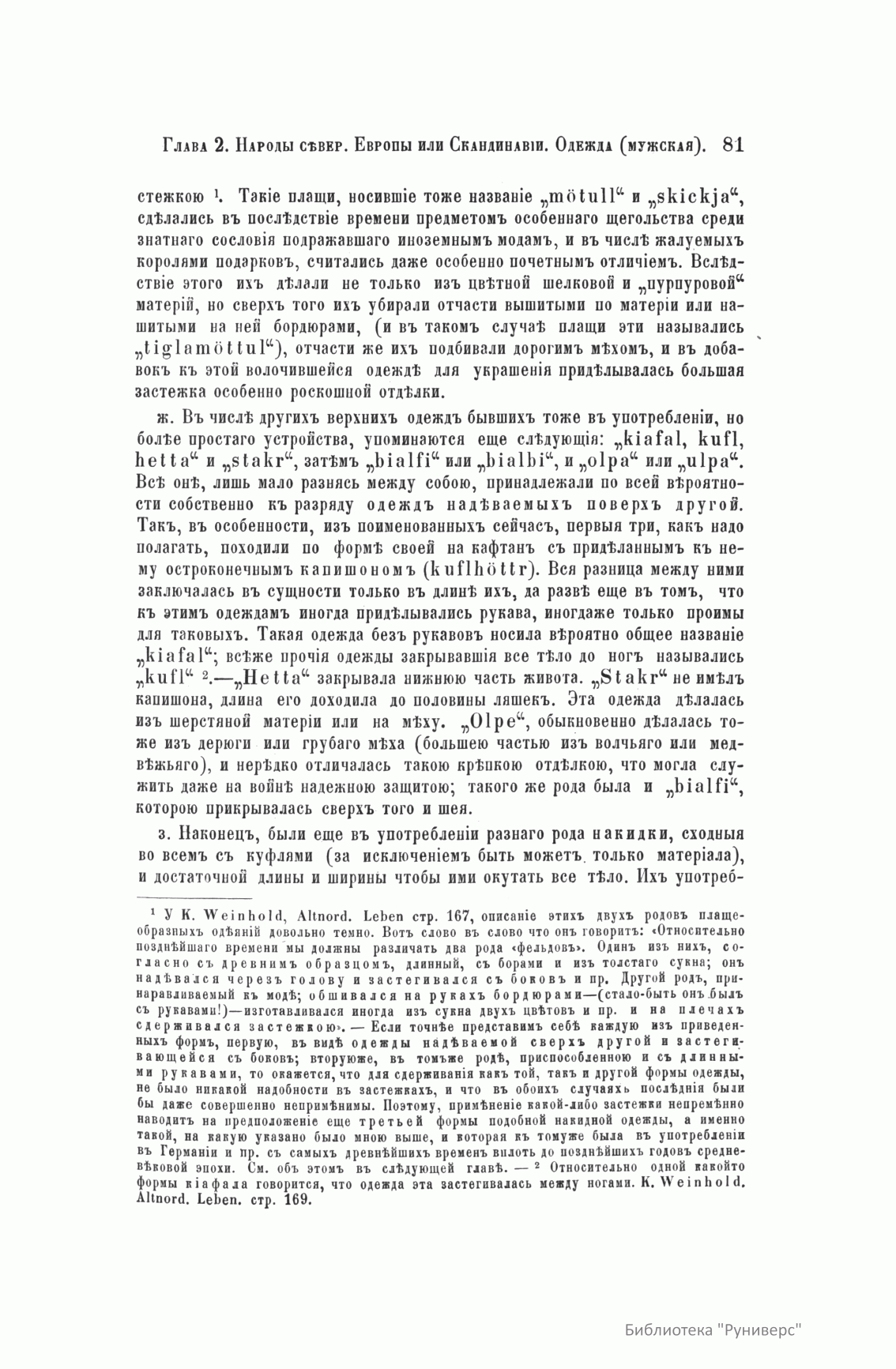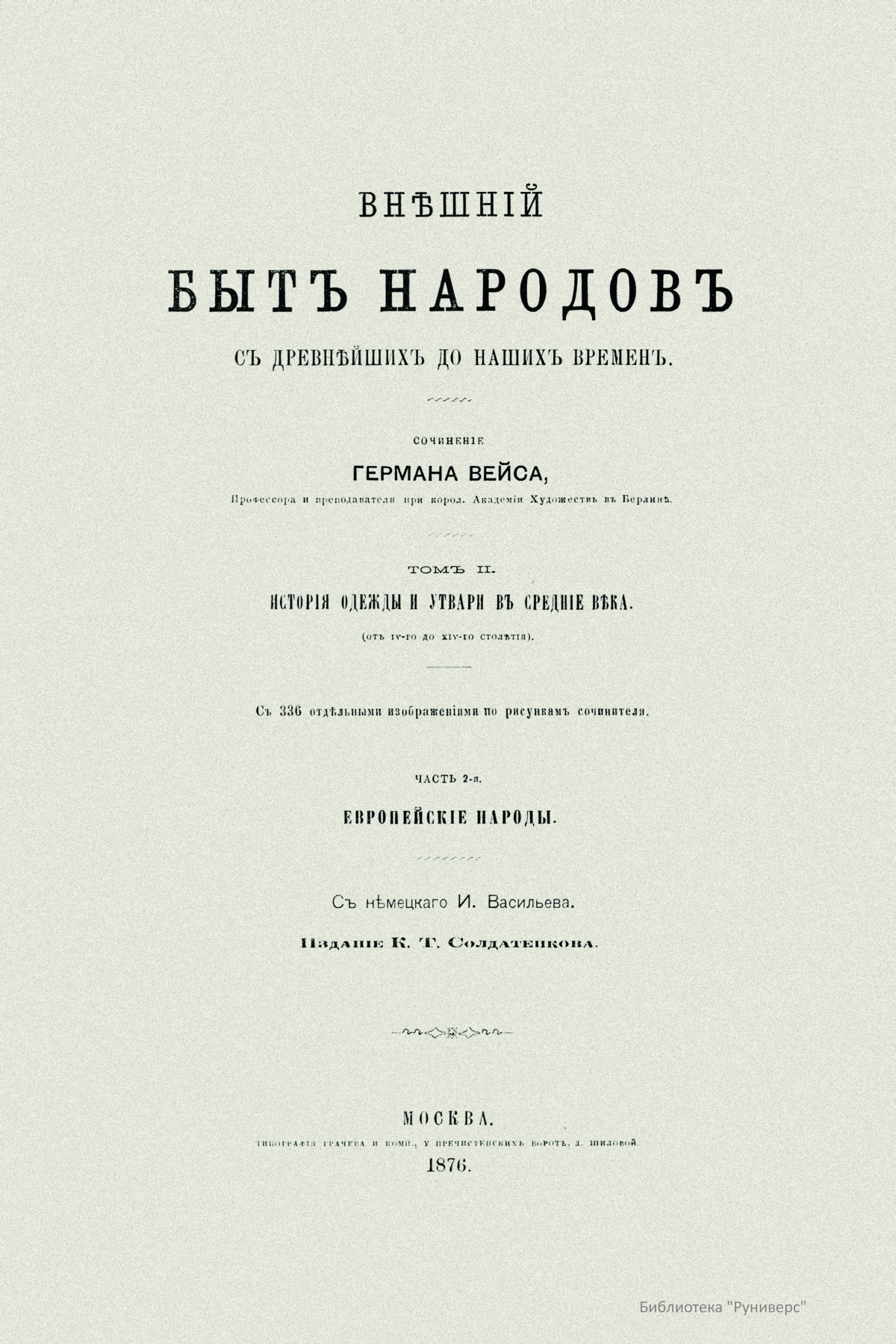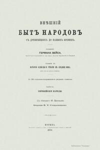Сочинение Германа Вейса, профессора и преподавателя Берлинской Академии художеств, адресовано прежде всего художникам, а также всем интересующимся историей культуры разных народов. Книга состоит из трех частей. Первый том посвящен древнему миру (Часть первая – восточные народы: древние народы Африки (египтяне, эфиопяне), древние народы Азии (аравитяне, народы западной Азии, ассирияне и вавилоняне, мидяне и персы, евреи и финикияне, малоазийские народы, индусы, Китай). Часть вторая – западные народы: древнейшие народы Европы (народы северовосточной Европы, народы европейской Сарматии, народы северной, средней и западной Европы, народы Испании, народы Греции, народы Италии). Второй том посвящен средним векам до начала XIV столетия (Часть первая – Византия и Восток. Часть вторая – европейские народы). Третий том продолжен до второй половины XIX века (Часть первая – от XIV до XVI столетия. Часть вторая – с XVI столетия). Все содержание внешнего быта автор распределяет по трем рубрикам: одежда и вооружение, постройки, утварь (постройки рассматриваются только в первом томе, одежда и вооружение в немецком языке определяются одним словом, которому нет аналога в русском, – die Tracht). Автор придает своим рубрикам очень широкий объем. В первую рубрику кроме вооружения вместе с уборами и украшениями входит и убранство волос, и косметические средства. Вторая, «постройки», охватывает не только всякого рода здания, но и мосты, дороги, каналы, судостроение, военный стан – все то, к чему можно приложить понятие «постройки». Еще шире третья рубрика – «утварь». В нее входят боевые колесницы, осадные машины, сосуды, мебель, храмовая утварь, музыкальные инструменты, игральные приборы и пр. В книге представлены копии рисунков, сделанных автором с самых лучших и достоверных источников без малейших отступлений.