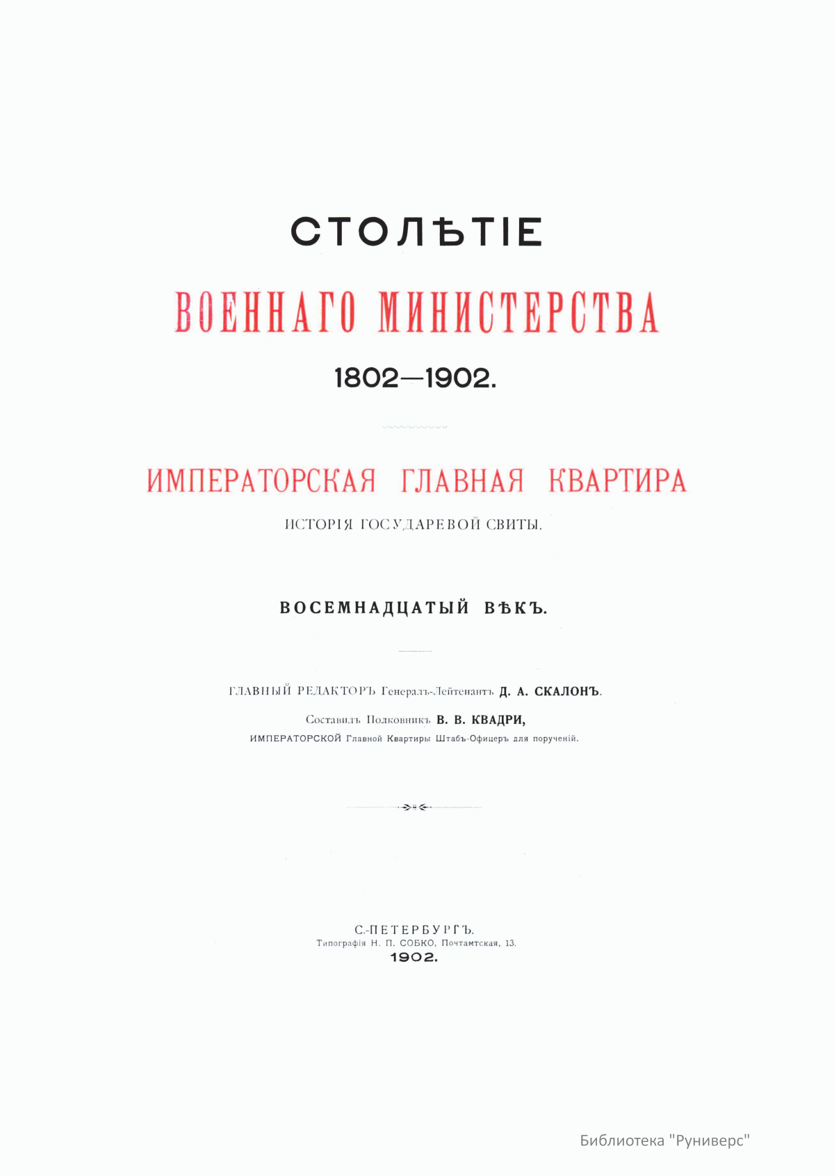 Столетие военного министерства. 1802-1902. Императорская главная квартира. История государевой свиты. Восемнадцатый век. Приложения