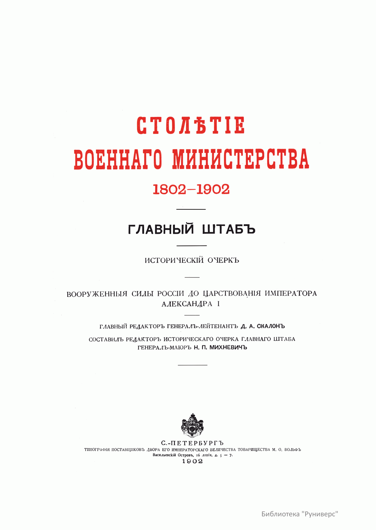 Столѣтiе военнаго министерства. 1802-1902. Главный штабъ. Историческiй очеркъ. Вооруженныя силы Россiи до царствованiя императора Александра I