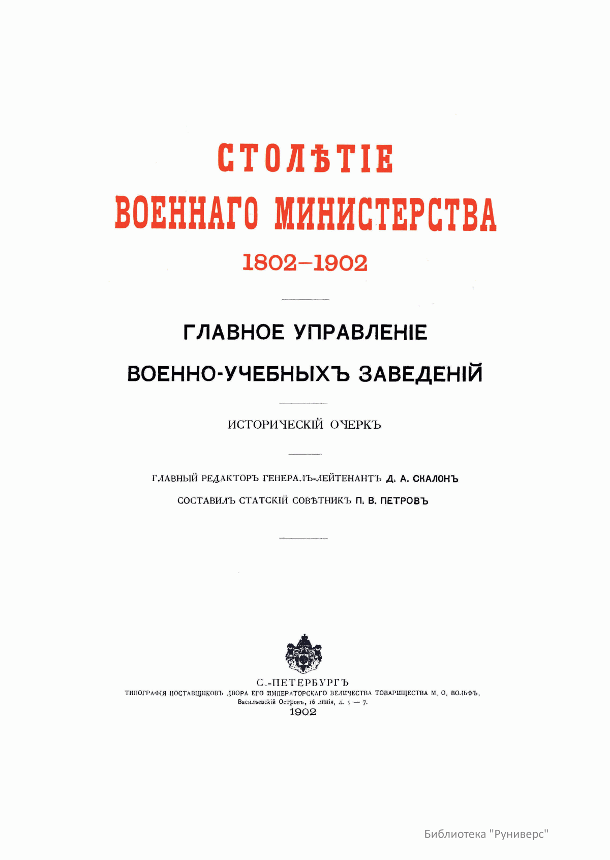 Столѣтiе военнаго министерства. 1802-1902. Главное управленiе военно-учебныхъ заведенiй. Историческiй очеркъ. Книга 1