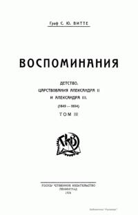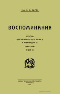 Воспоминания графа, русского государственного деятеля Сергея Юльевича Витте (1849 – 1915) опубликованы в трех томах. Первый том охватывает события от смерти Александра III до 17 октября 1905 года. Второй том – от манифеста 17 октября 1905 года до убийства Столыпина в 1911 г. В третьем томе изложение доведено до смерти Александра III и включает воспоминания о детстве автора. Все три тома снабжены подробным оглавлением.
