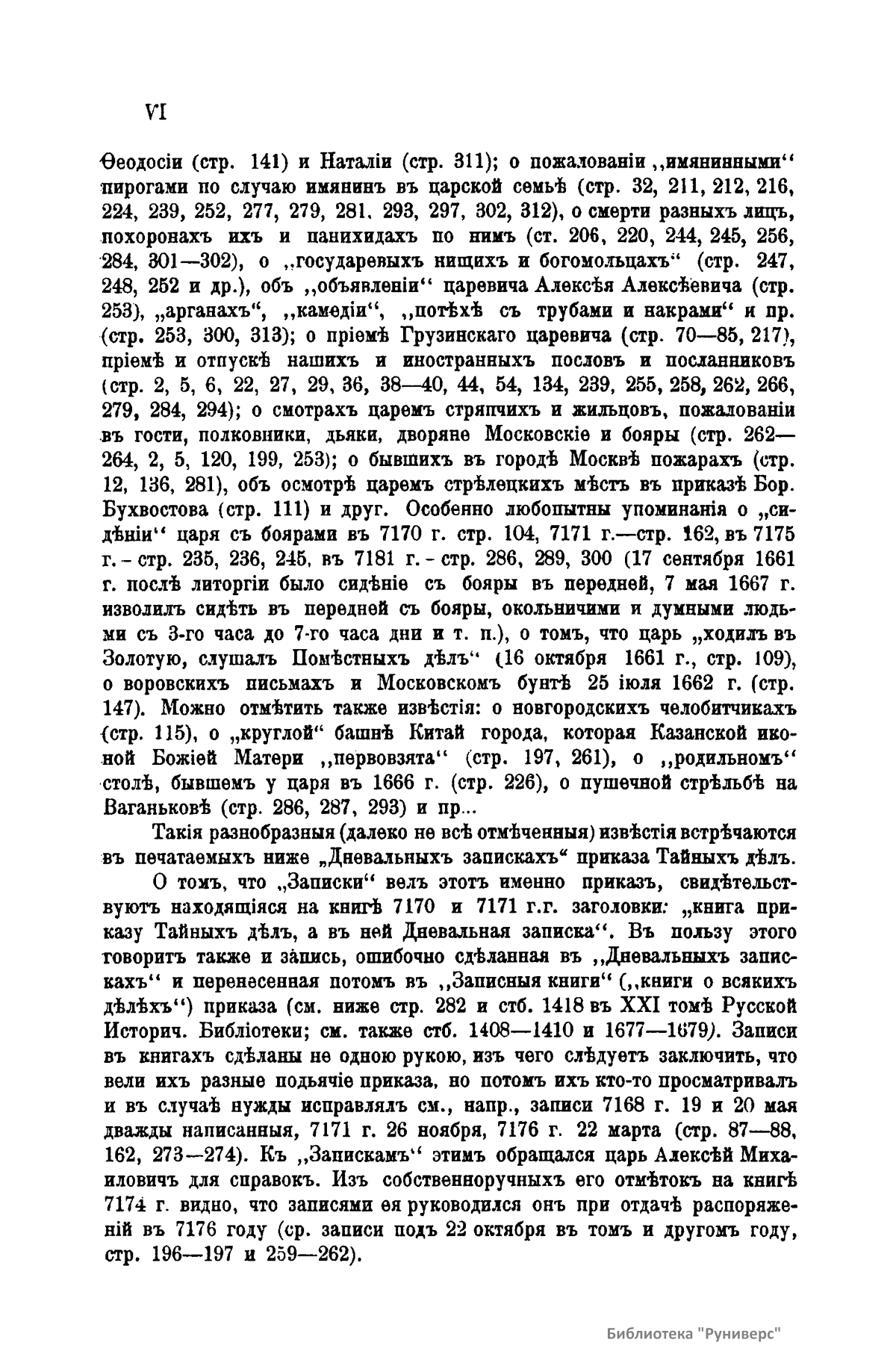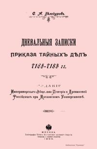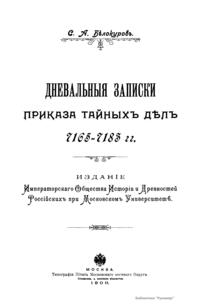 Приказ тайных дел, или тайный приказ, был учрежден около 1658 г. царем Алексеем Михайловичем и являлся как бы собственной канцелярией царя. В нем заседали дьяк и человек 10 подьячих. Бояре и думные люди не входили в состав приказа, так как он был учрежден главным образом для наблюдения за их деятельностью. Подьячие приказа тайных дел посылались с послами в разные государства и на посольские съезды, а также с воеводами на войну. Они должны были следить за действиями послов и воевод и обо всем доносить царю. В приказе тайных дел производились следствия по важнейшим государственным делам, ведались мастера гранатного дела, само гранатное дело и заводы. В ведении этого же приказа состояла любимая царская потеха – птицы, кречеты и ястребы, с особым штатом для их ловли и обучения, а также голубятни, в которых было более 100 тысяч голубиных гнезд для корма хищных птиц. Приказ тайных дел был уничтожен со смертью царя Алексея Михайловича. В настоящем издании опубликованы «Дневальные записки» приказа тайных дел. Они состоят из поденных известий: 1). О царе Алексее Михайловиче – где он был и что делал в данный день. 2). О том, какая была погода. 3). Какой стрелецкий приказ стоял на карауле около дворца. Издание представляет несомненный интерес для занимающихся историей XVII века.