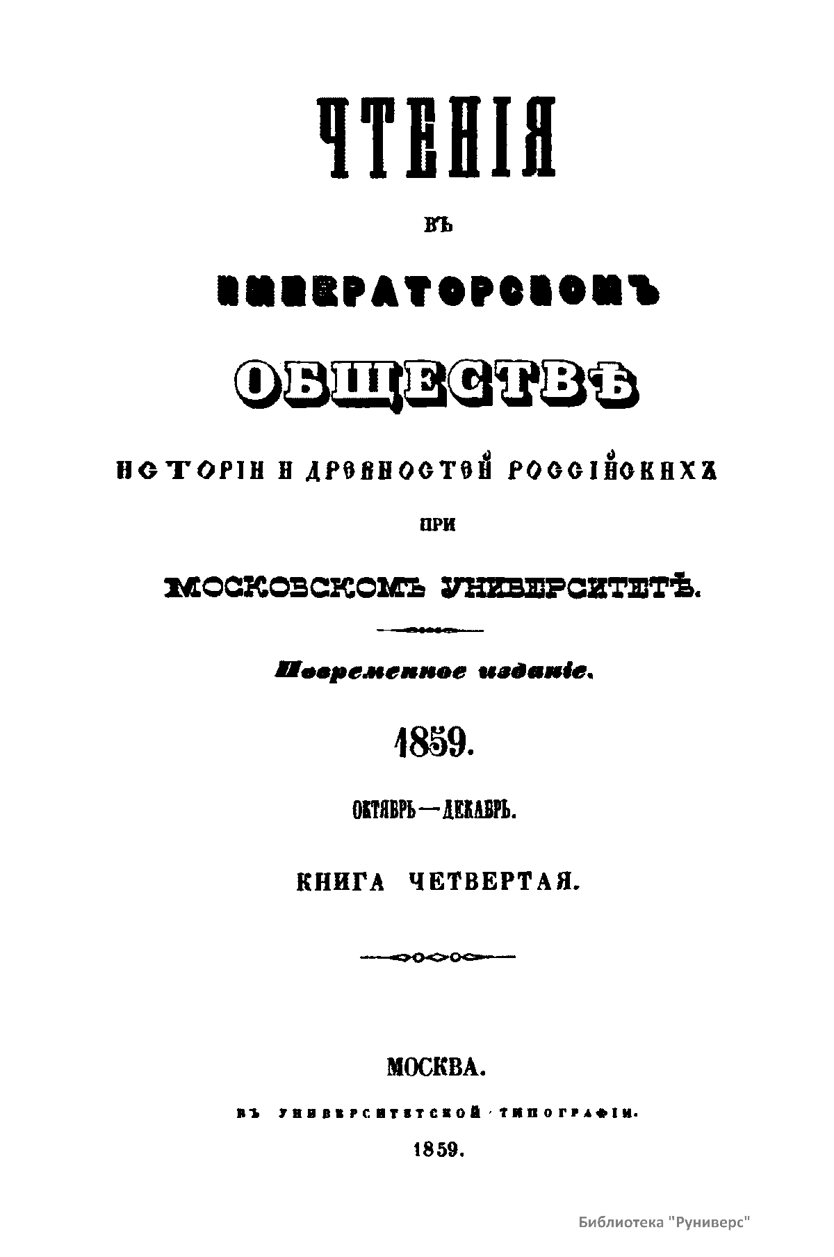 Чтенiя въ Императорскомъ Обществѣ Исторiи и Древностей Россiйскихъ при Московскомъ Университетѣ. 1859. Октябрь-Декабрь. Книга четвертая