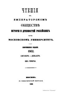 Чтенiя въ Императорскомъ Обществѣ Исторiи и Древностей Россiйскихъ при Московскомъ Университетѣ. 1862. Октябрь-Декабрь. Книга четвертая