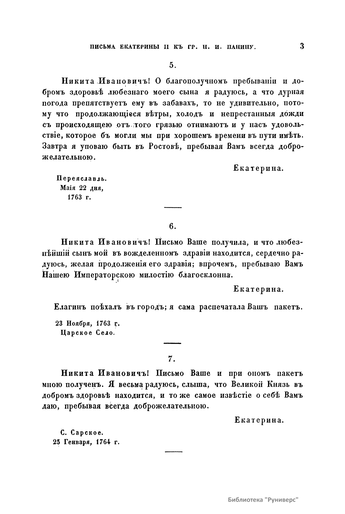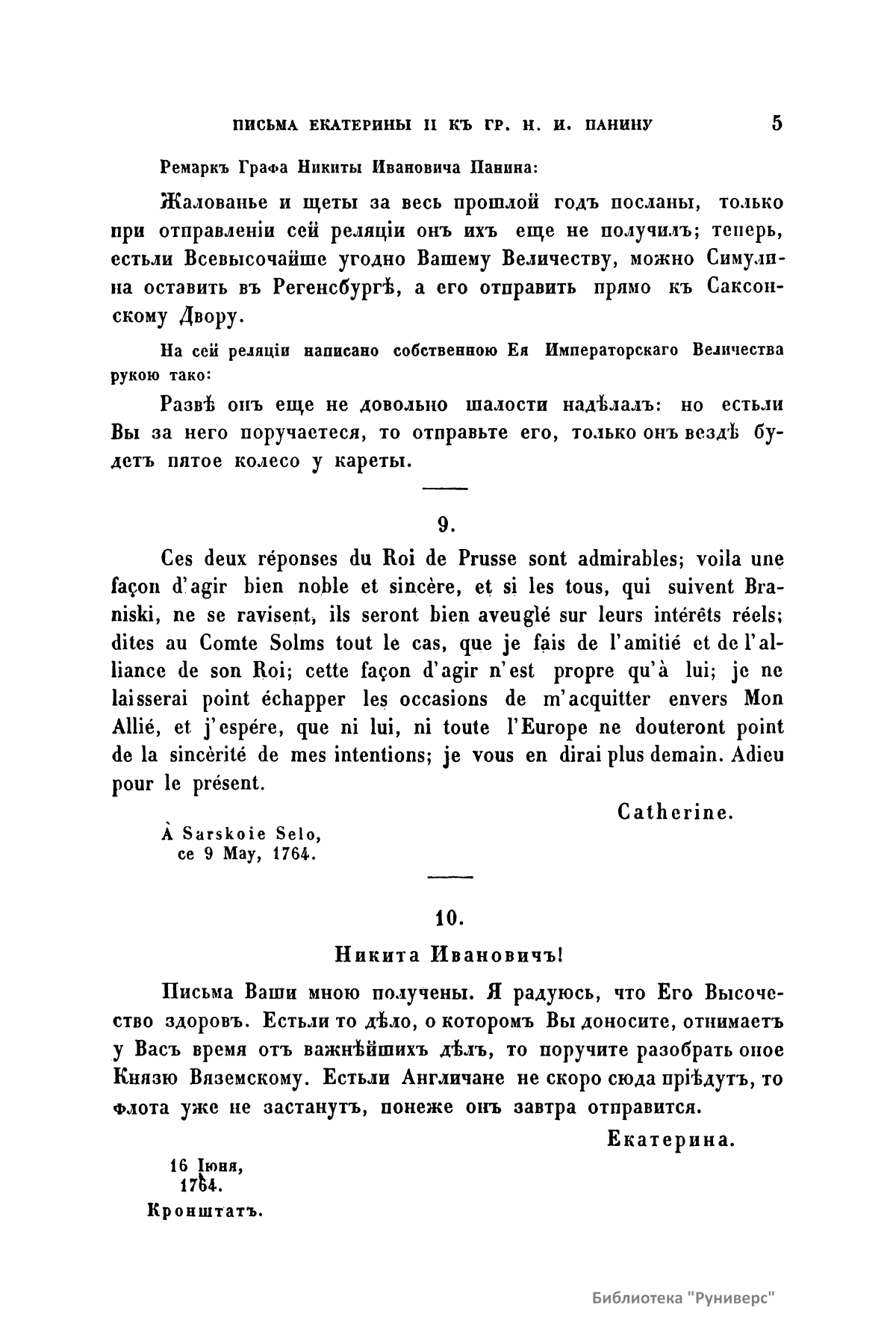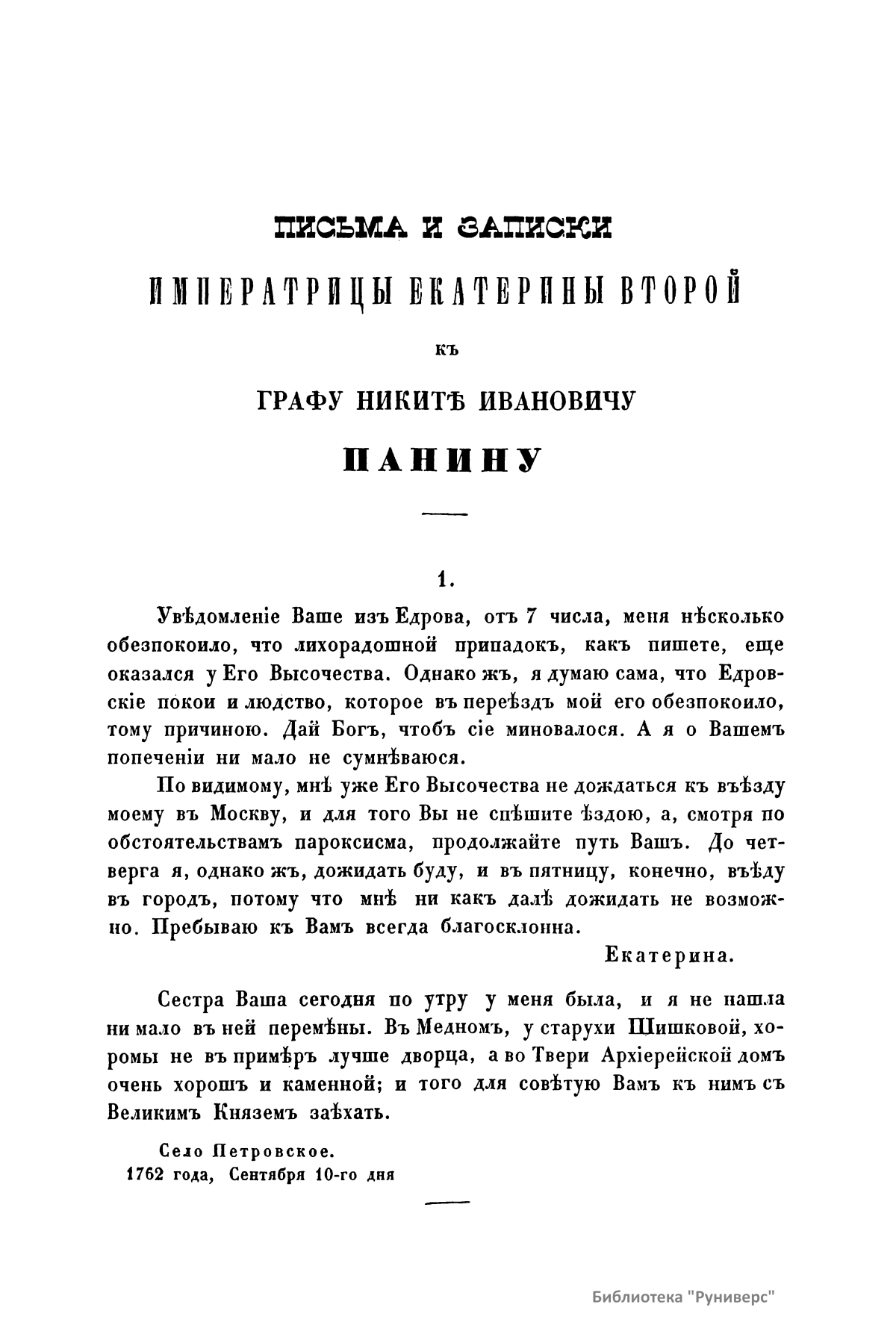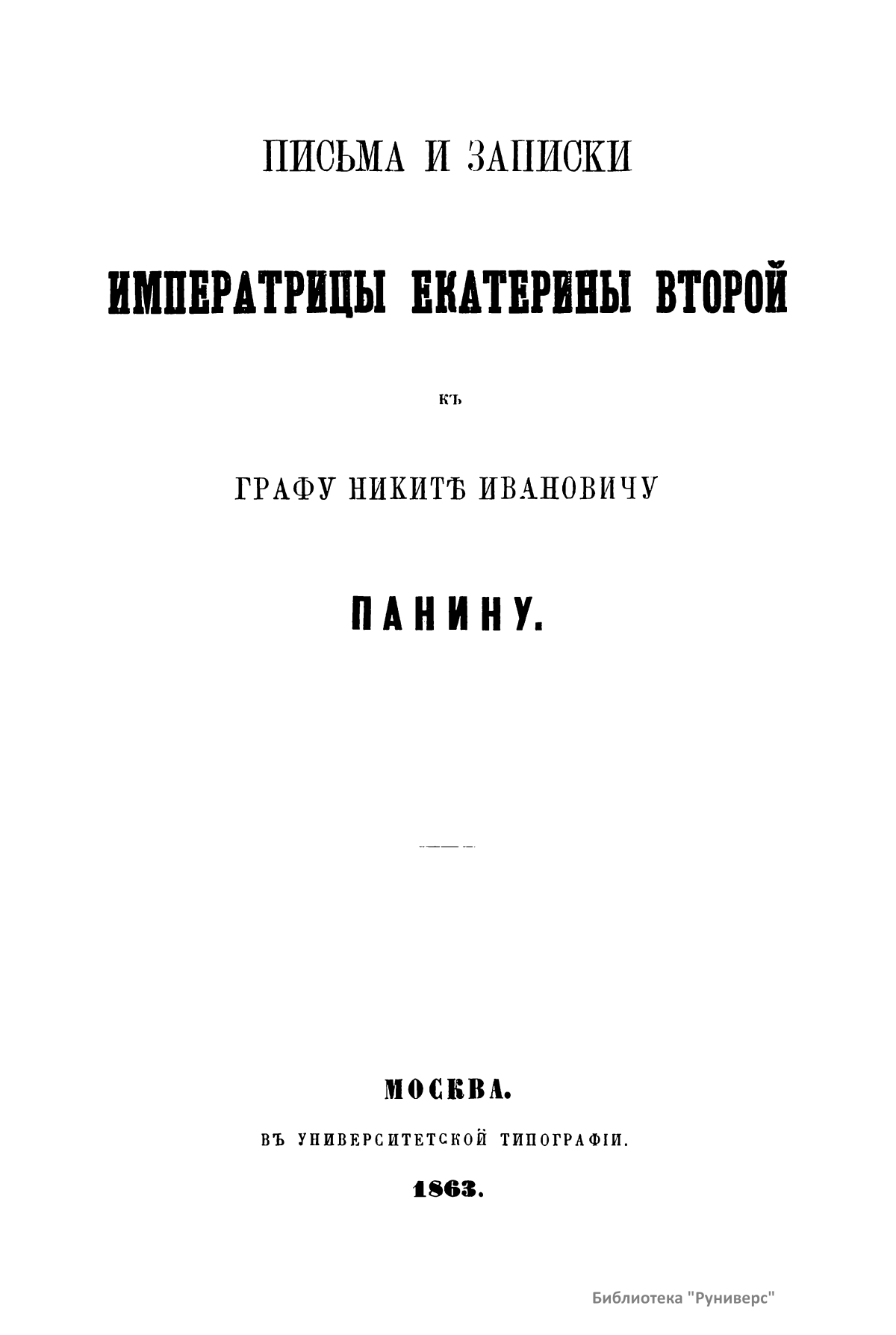 Письма и записки Императрицы Екатерины Второй къ Графу Никитѣ Ивановичу Панину