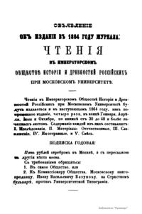 «Чтения в Императорском обществе истории и древностей российских» – периодическое издание трудов Общества. Выпускались отдельными книгами на протяжении 72 лет с десятилетним перерывом. Первая книга вышла в свет в январе 1846 г. Каждая книга состояла из четырех разделов: исторических исследований, отечественных исторических документальных материалов, иностранных материалов и смеси. Публиковались также исследования и материалы по археологии, этнографии, нумизматике, палеографии и другим дисциплинам. До июня 1848 г. было выпущено 23 книги «Чтений». В июньской книге за 1848 г. О. М. Бодянский поместил записки Дж. Флетчера о Московском государстве, что вызвало недовольство Николая I. «Чтения» были закрыты, а Бодянский удален из Московского университета. Издание «Чтений» возобновилось только в 1858 г., когда Бодянский снова стал секретарем общества. Издание приняло славянофильское направление, к прежним четырем разделам «Чтений» прибавился раздел славянских материалов. С 1858 г. «Чтения» выходили в свет четыре раза в год.