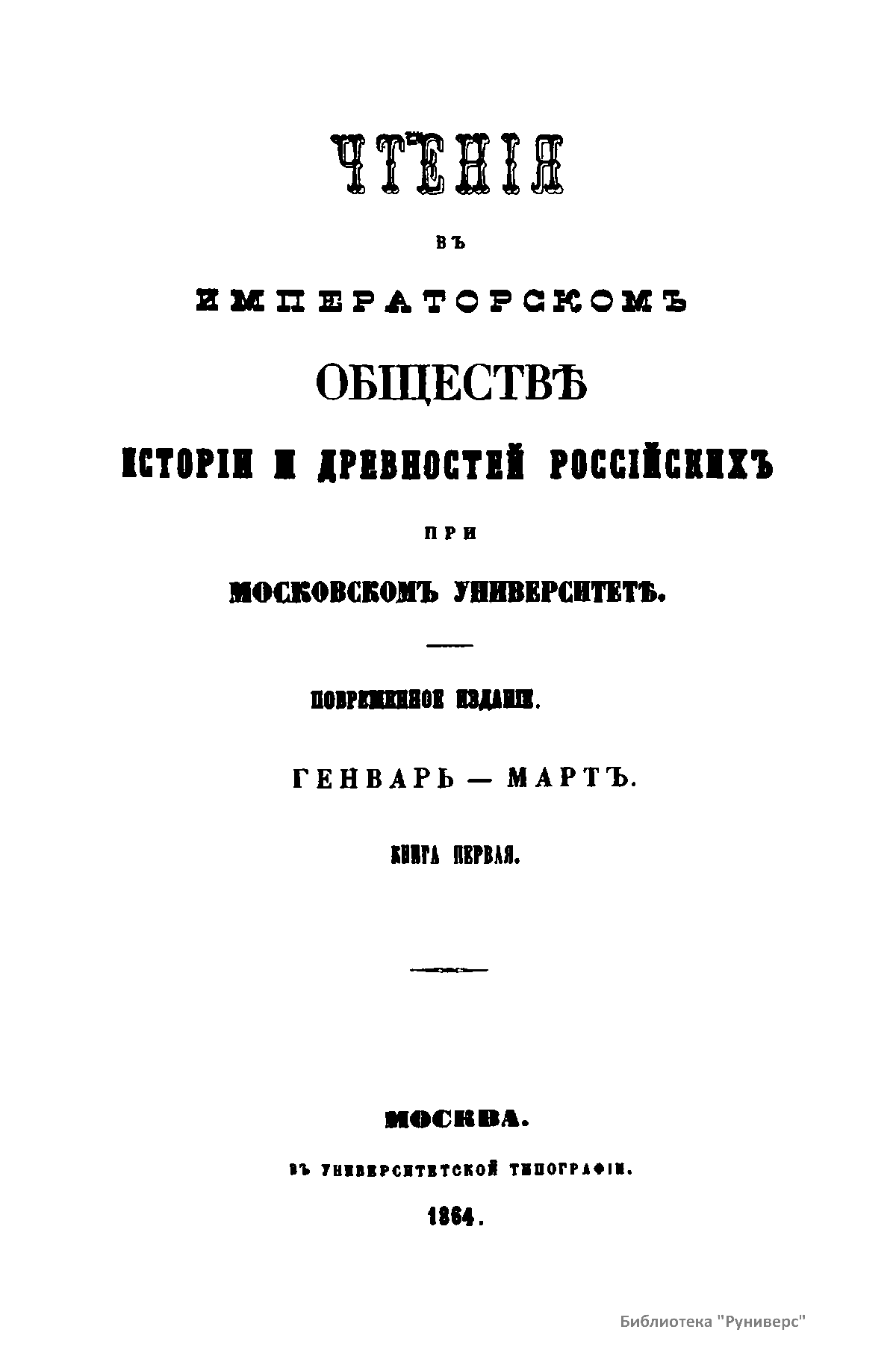 Чтенiя въ Императорскомъ Обществѣ Исторiи и Древностей Россiйскихъ при Московскомъ Университетѣ. 1864. Генварь-Мартъ. Книга первая