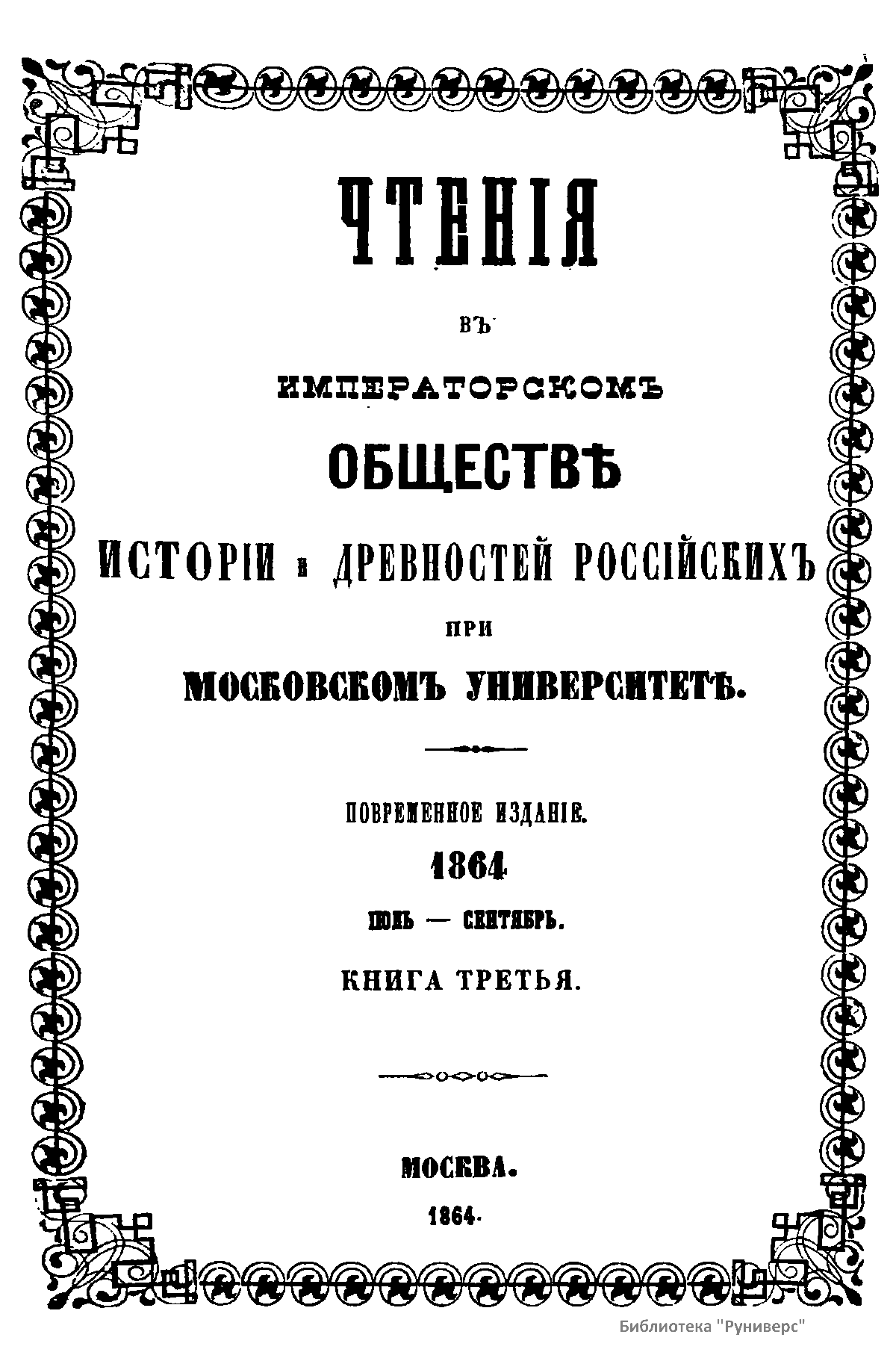 Чтенiя въ Императорскомъ Обществѣ Исторiи и Древностей Россiйскихъ при Московскомъ Университетѣ. 1864. Iюль-Сентябрь. Книга третья