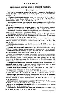 «Чтения в Императорском обществе истории и древностей российских» – периодическое издание трудов Общества. Выпускались отдельными книгами на протяжении 72 лет с десятилетним перерывом. Первая книга вышла в свет в январе 1846 г. Каждая книга состояла из четырех разделов: исторических исследований, отечественных исторических документальных материалов, иностранных материалов и смеси. Публиковались также исследования и материалы по археологии, этнографии, нумизматике, палеографии и другим дисциплинам. До июня 1848 г. было выпущено 23 книги «Чтений». В июньской книге за 1848 г. О. М. Бодянский поместил записки Дж. Флетчера о Московском государстве, что вызвало недовольство Николая I. «Чтения» были закрыты, а Бодянский удален из Московского университета. Издание «Чтений» возобновилось только в 1858 г., когда Бодянский снова стал секретарем общества. Издание приняло славянофильское направление, к прежним четырем разделам «Чтений» прибавился раздел славянских материалов. С 1858 г. «Чтения» выходили в свет четыре раза в год.
