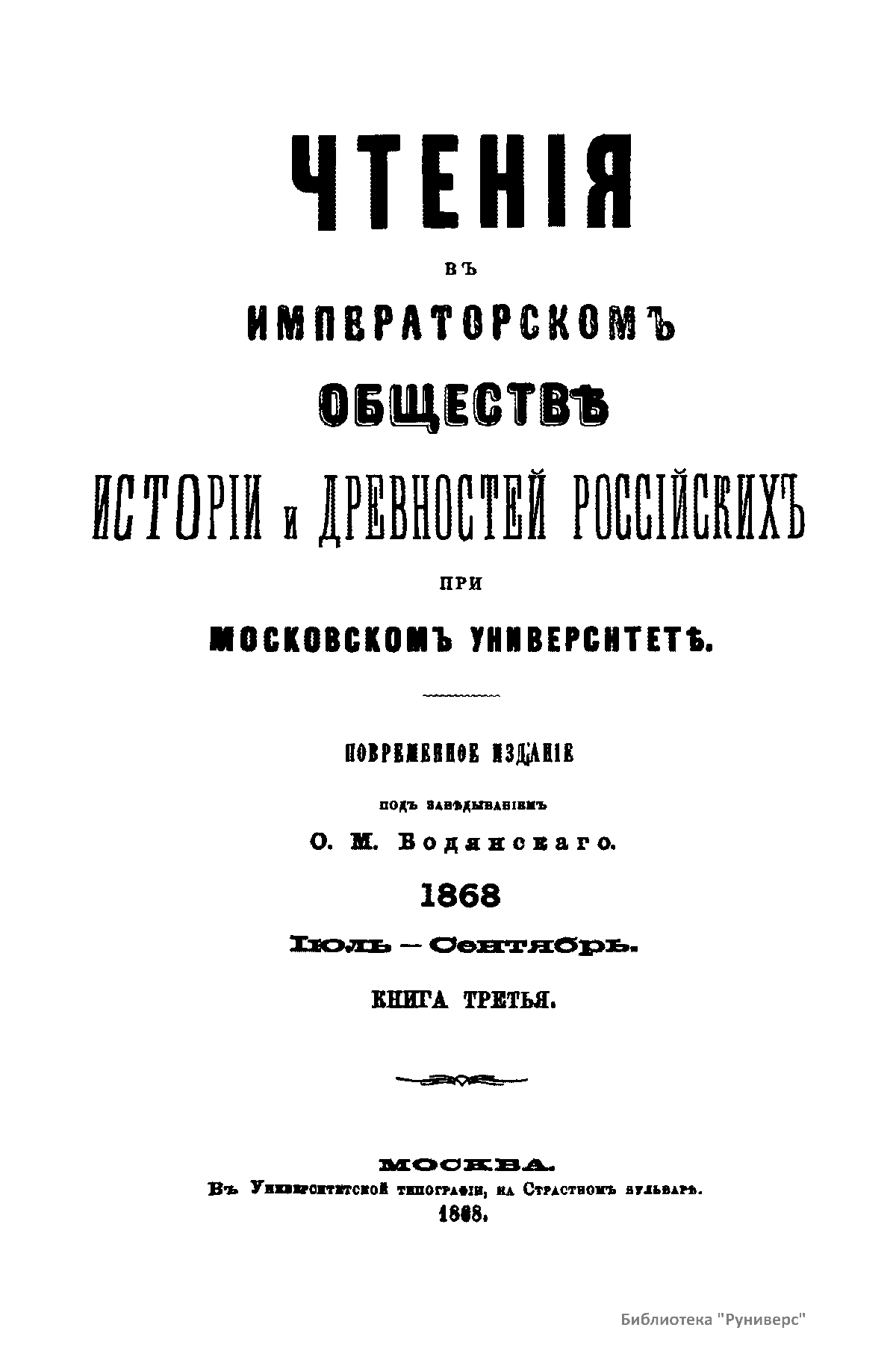 Чтенiя въ Императорскомъ Обществѣ Исторiи и Древностей Россiйскихъ при Московскомъ Университетѣ. 1868. Iюль-Сентябрь. Книга третья