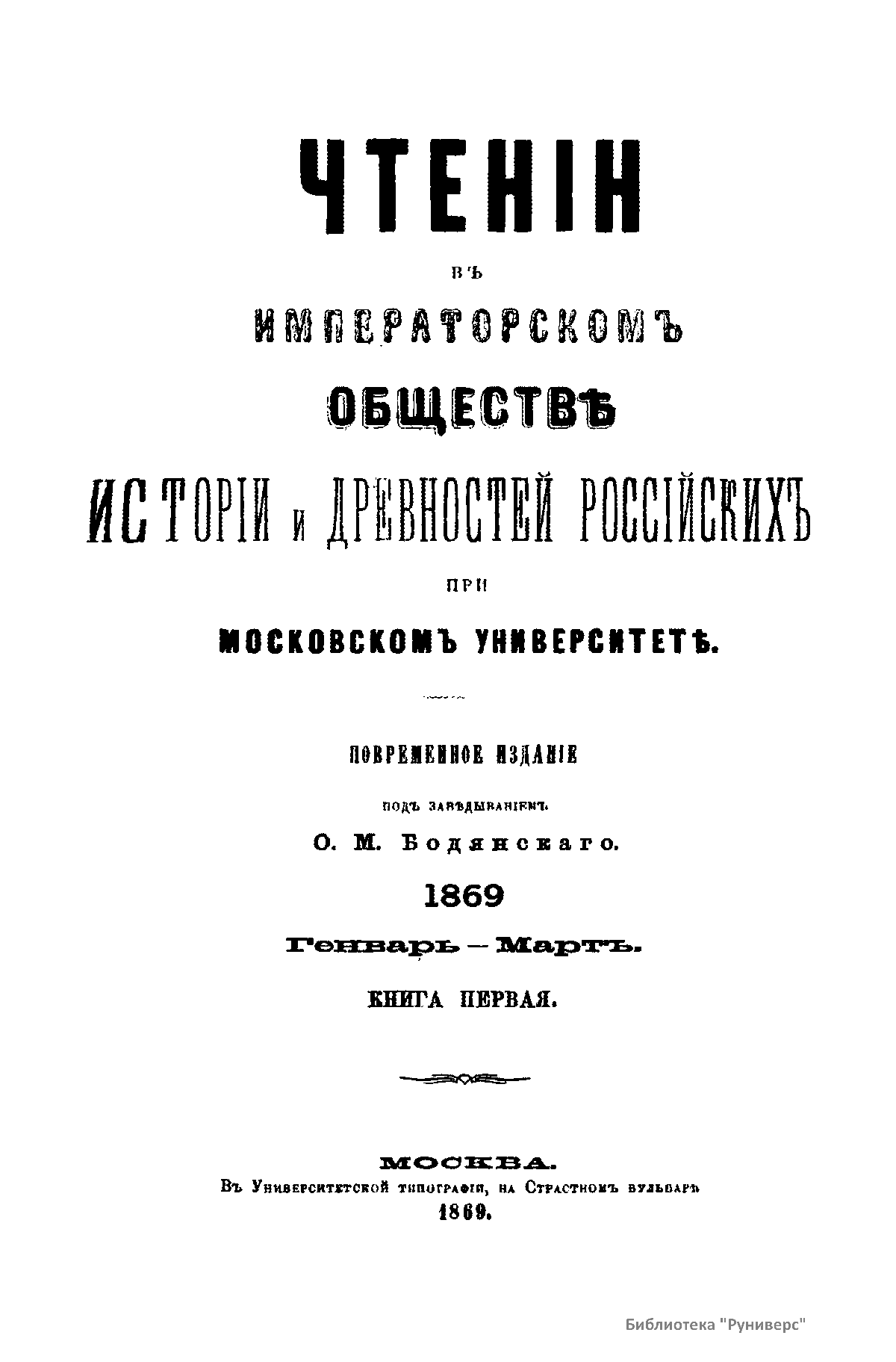 Чтенiя въ Императорскомъ Обществѣ Исторiи и Древностей Россiйскихъ при Московскомъ Университетѣ. 1869. Генварь-Мартъ. Книга первая